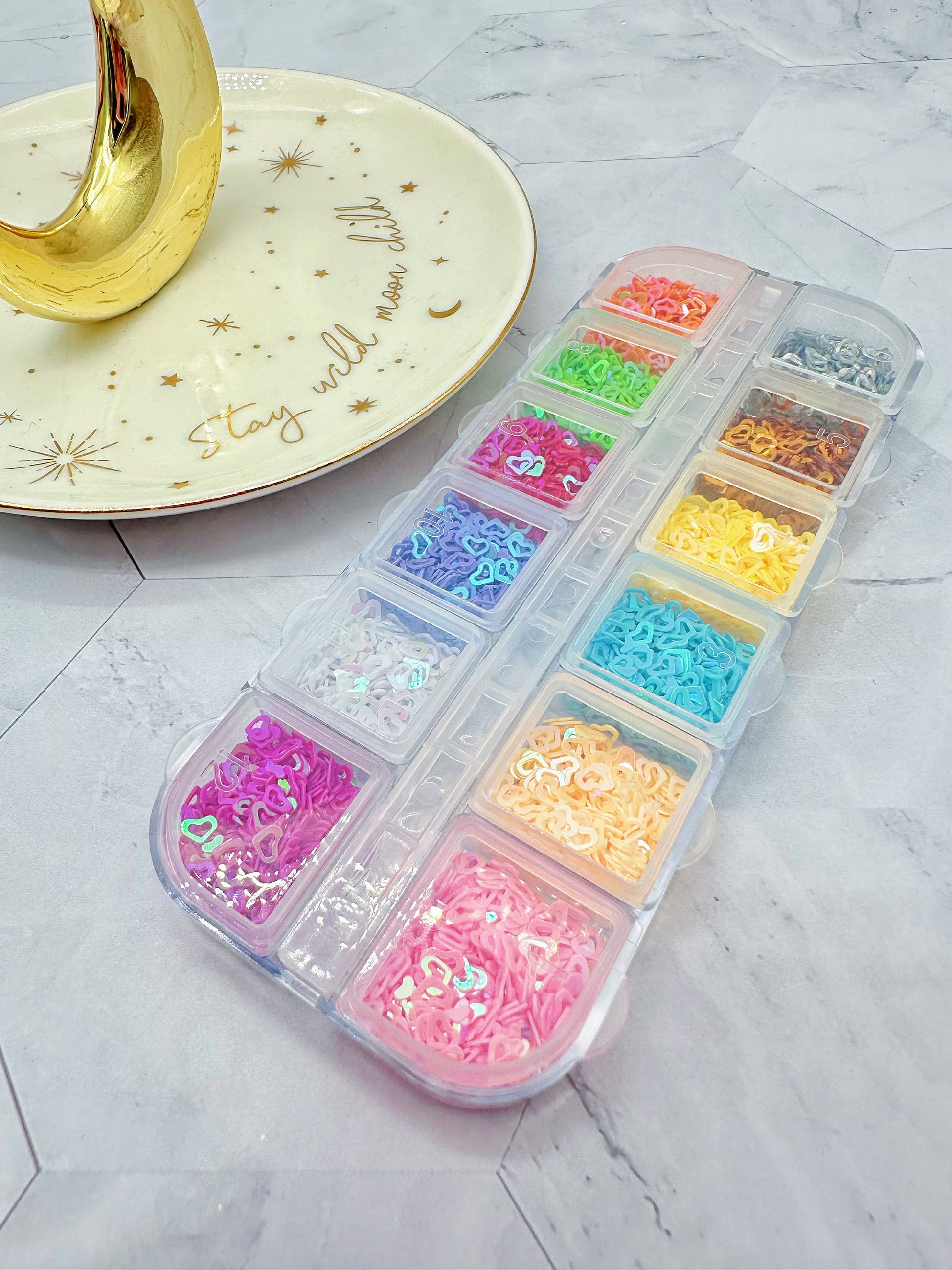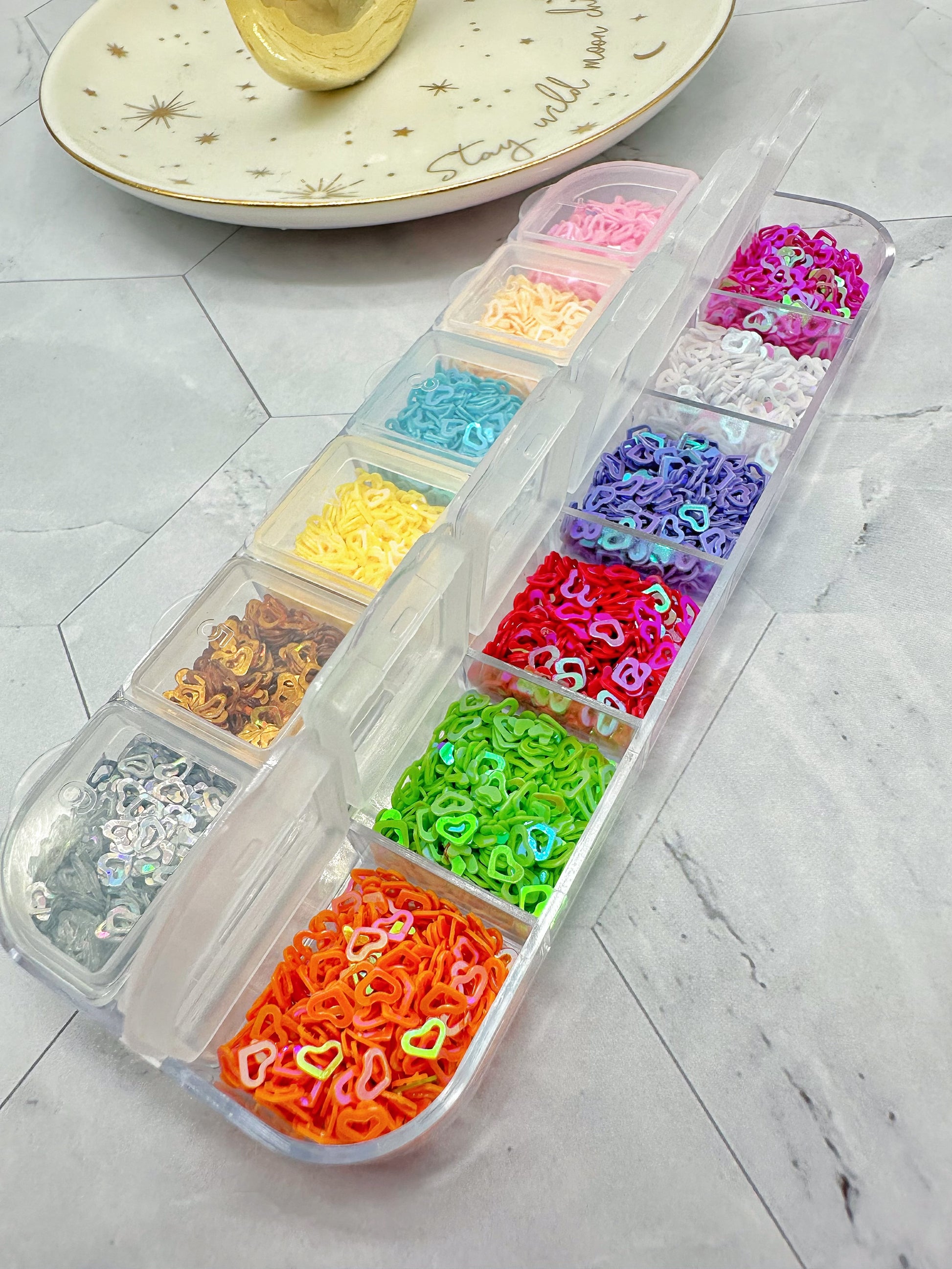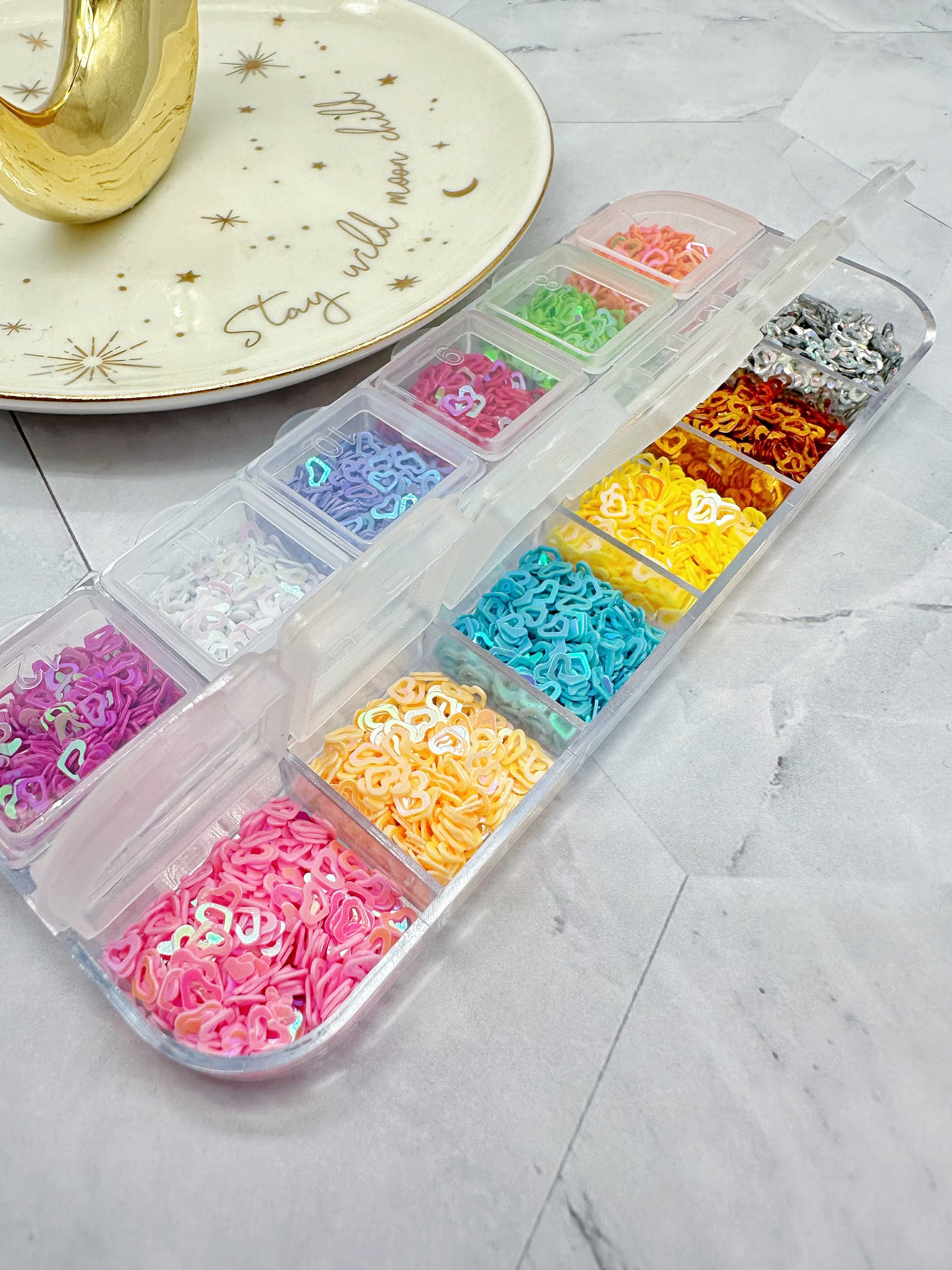These beautiful colour-shift glitter hearts come in a multi-compartment box for easy storage and use.