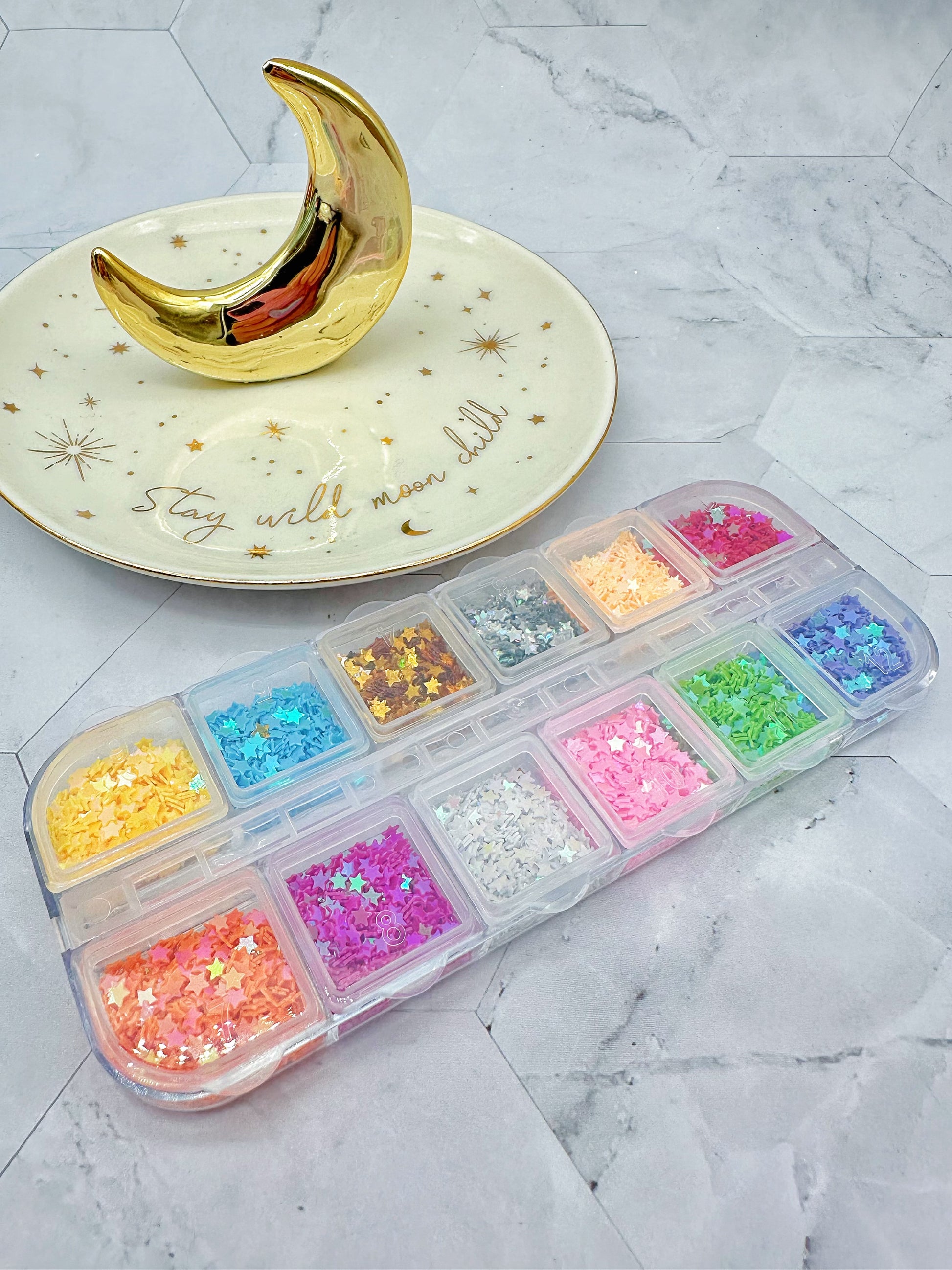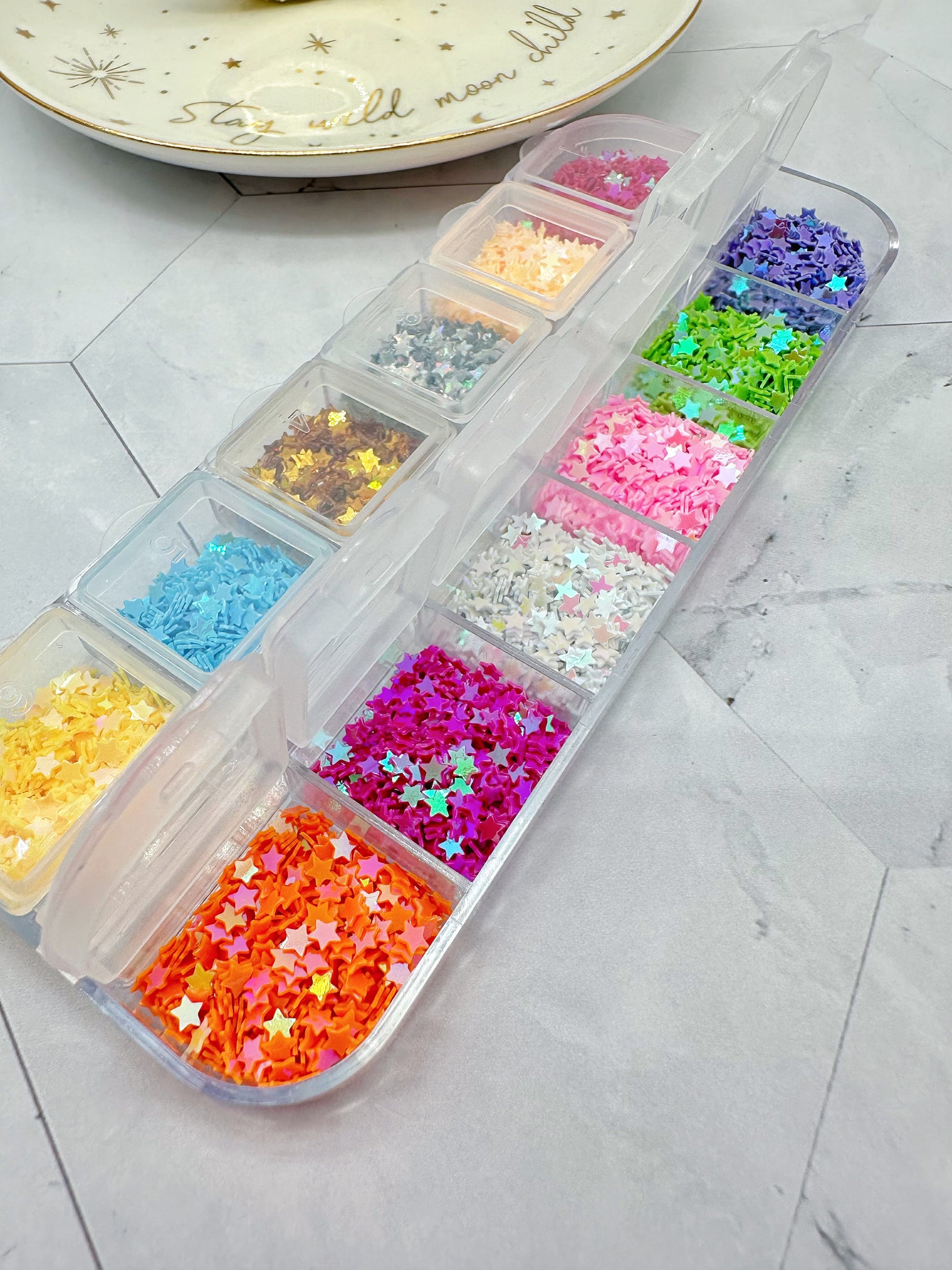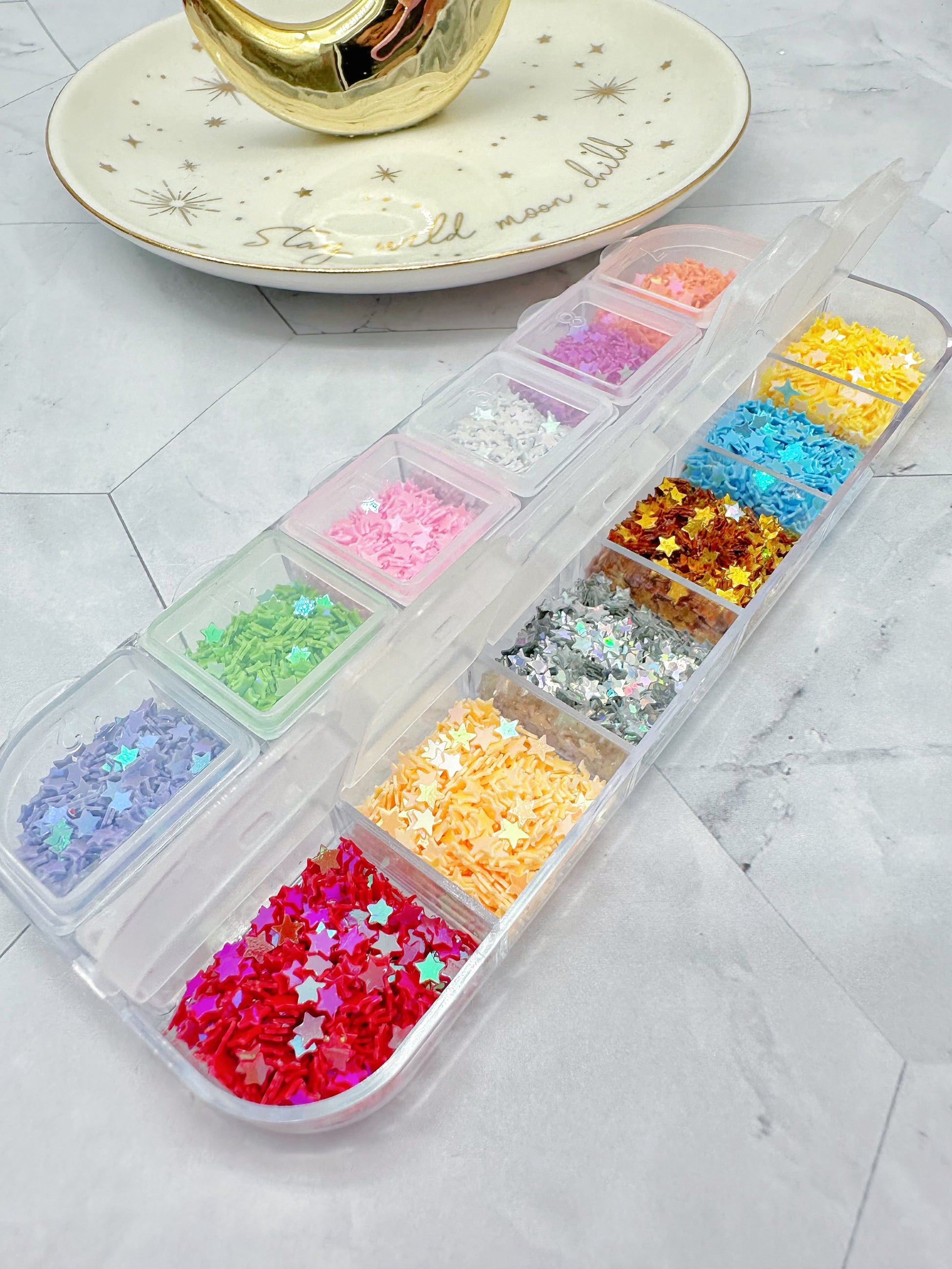 These beautiful colour-shift glitter stars come in a multi-compartment box for easy storage and use.