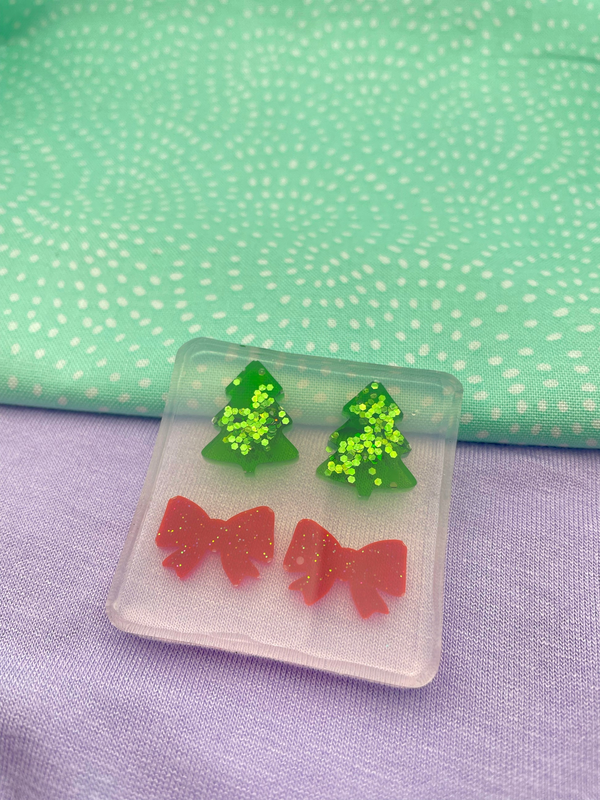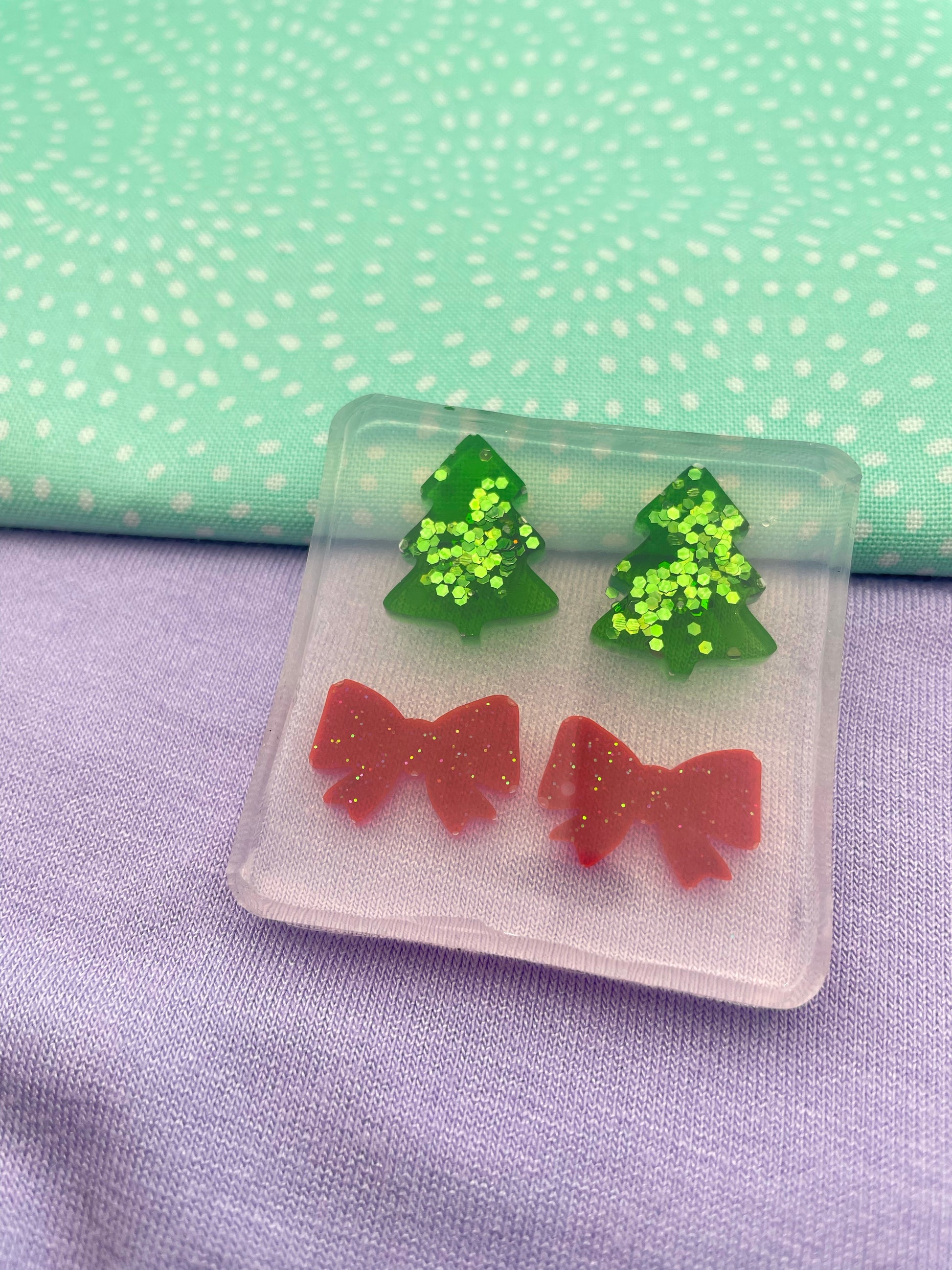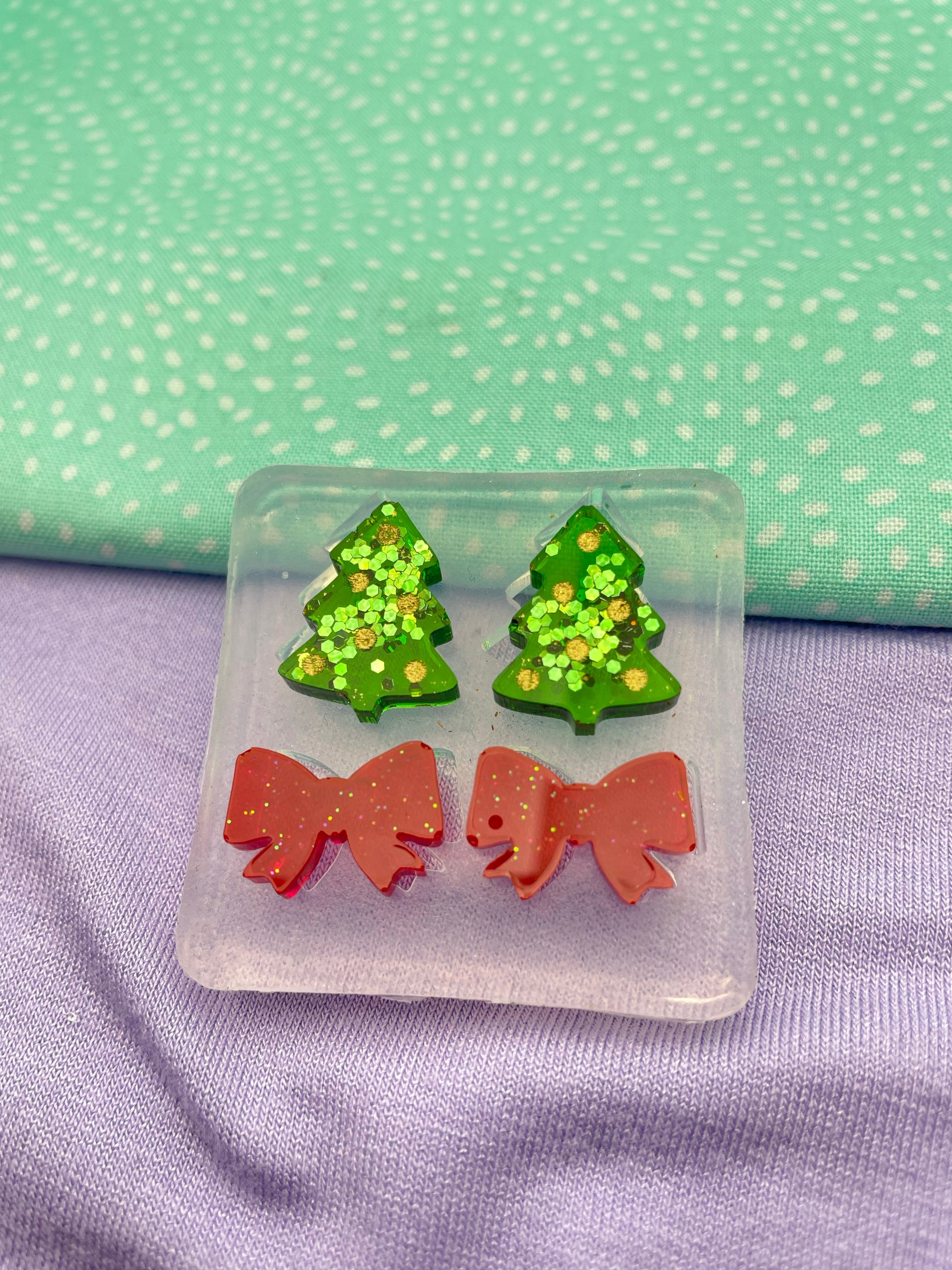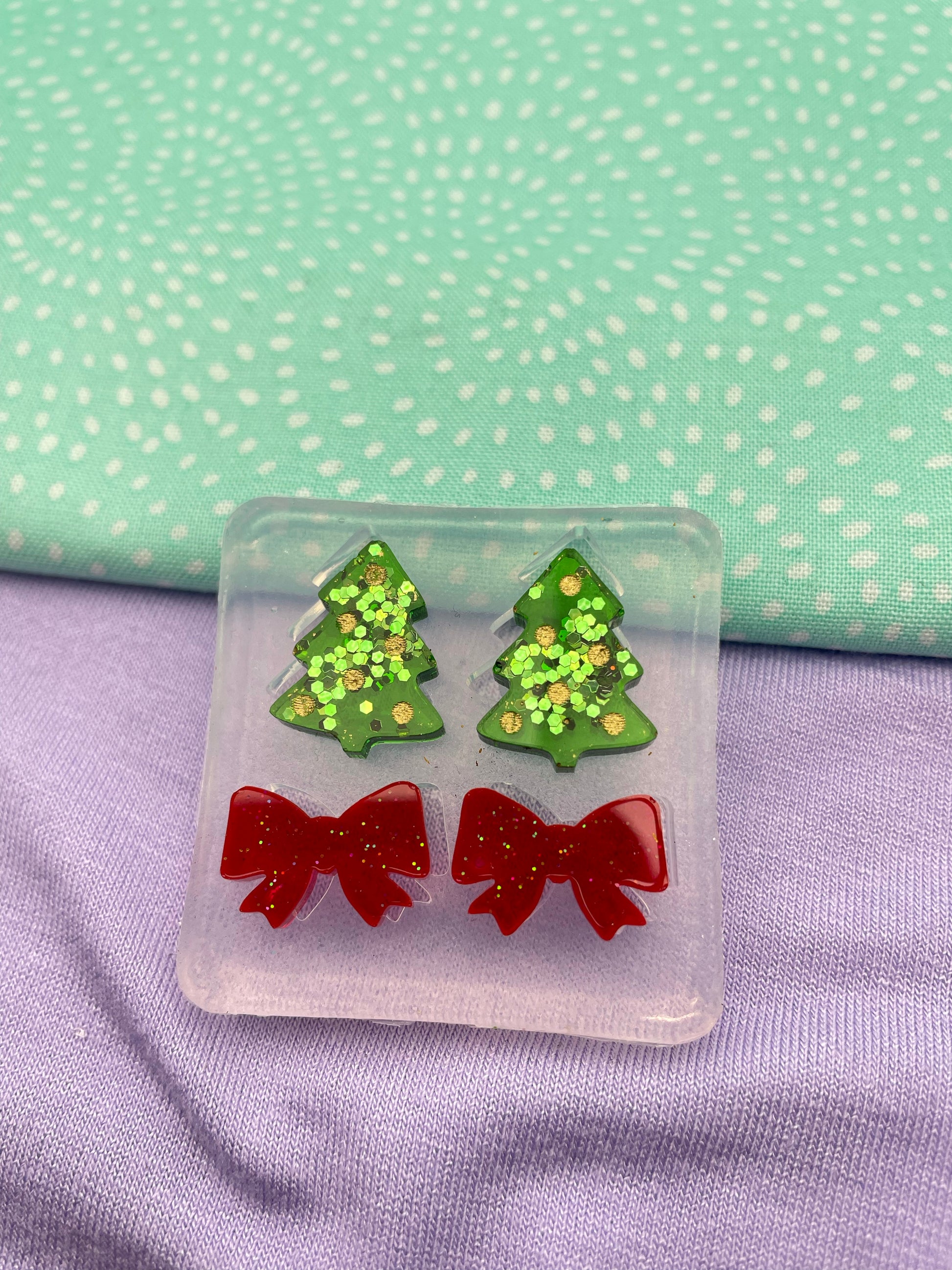 Mini Engraved Christmas Tree and Ribbon Bow Stud Earring Mold