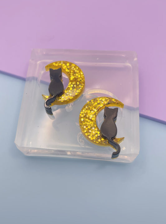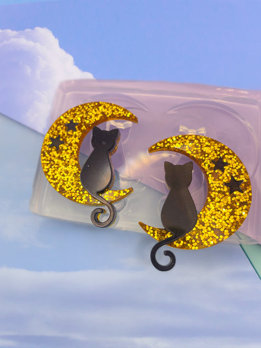 Mini Sitting Cat on Crescent Moon Stud Earring Mold