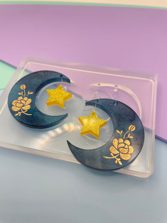 Engraved Peony Floral Crescent Moon Dangle Star Earring Mold