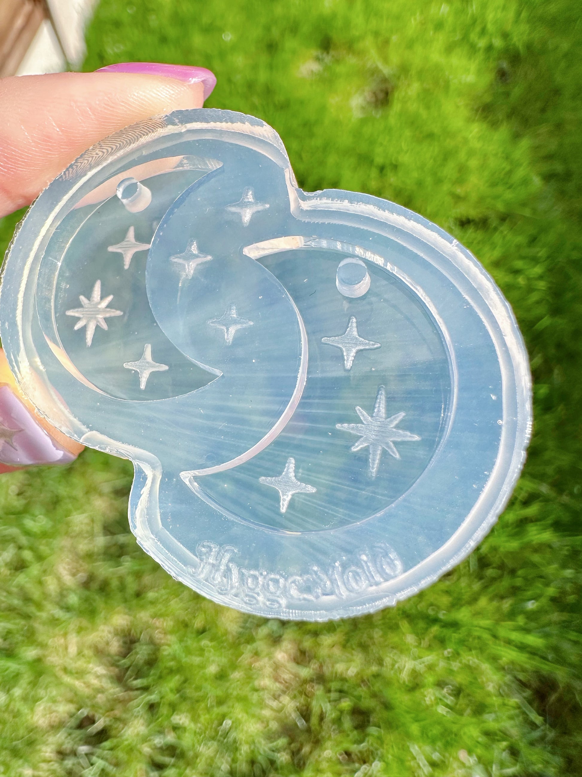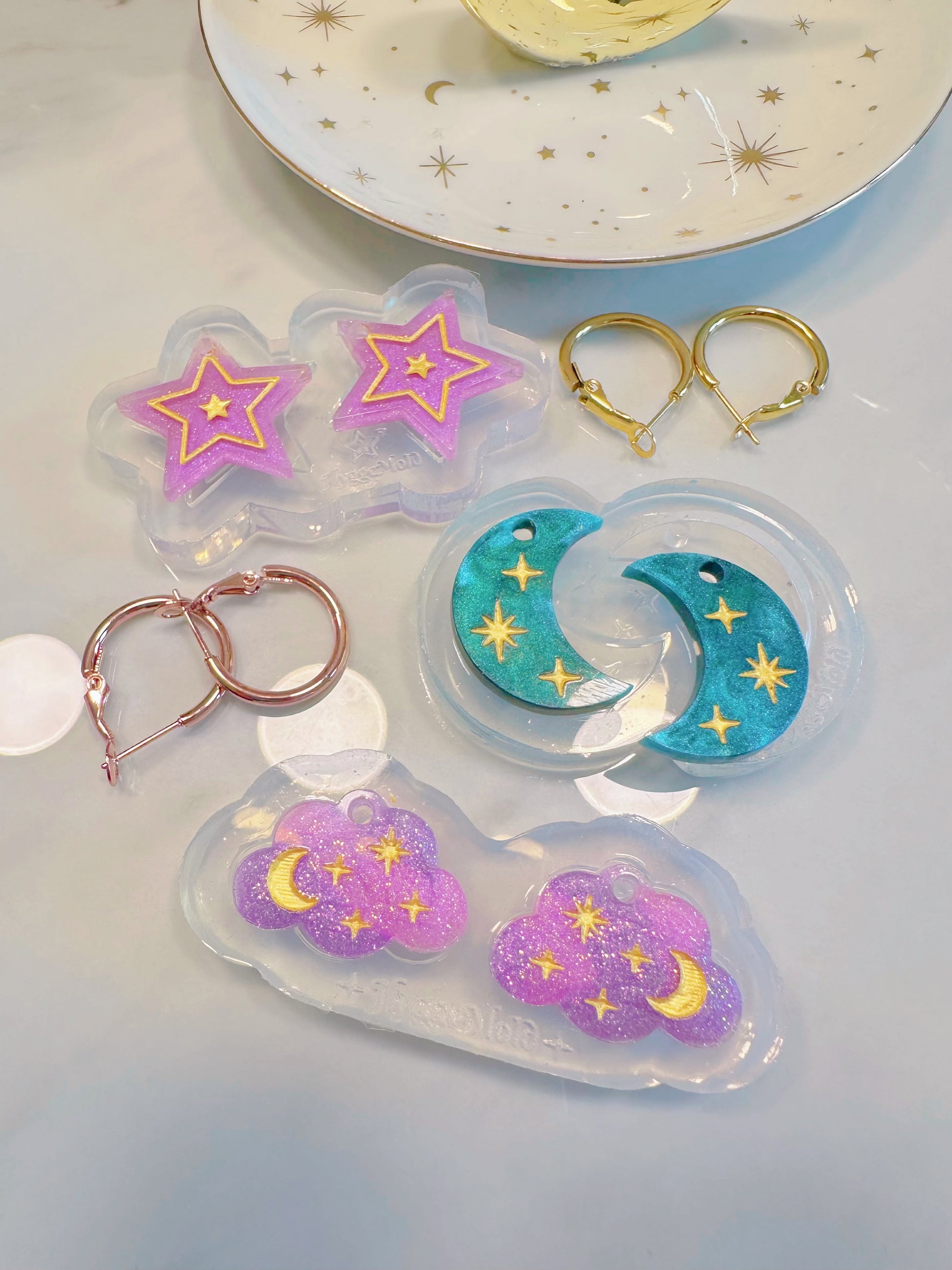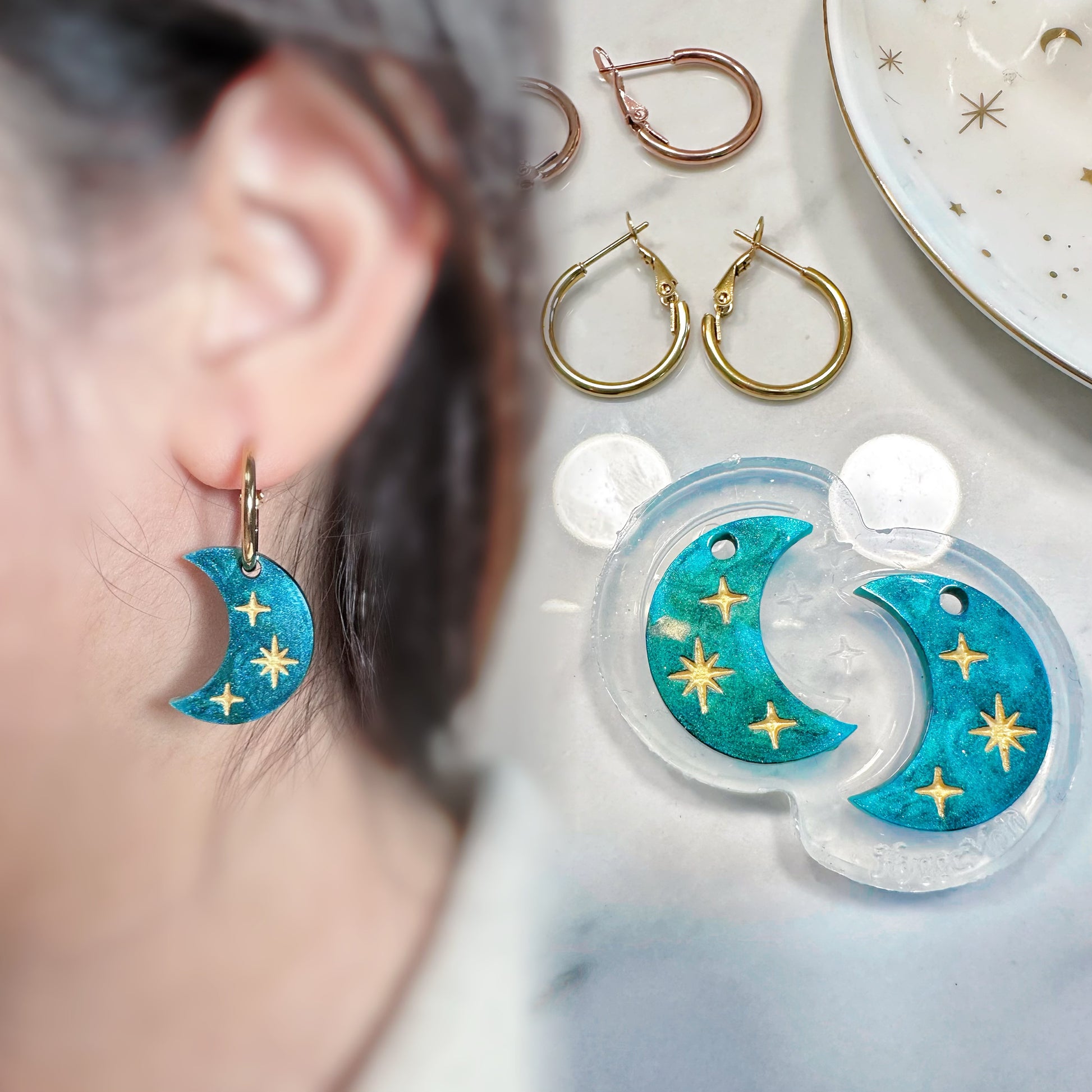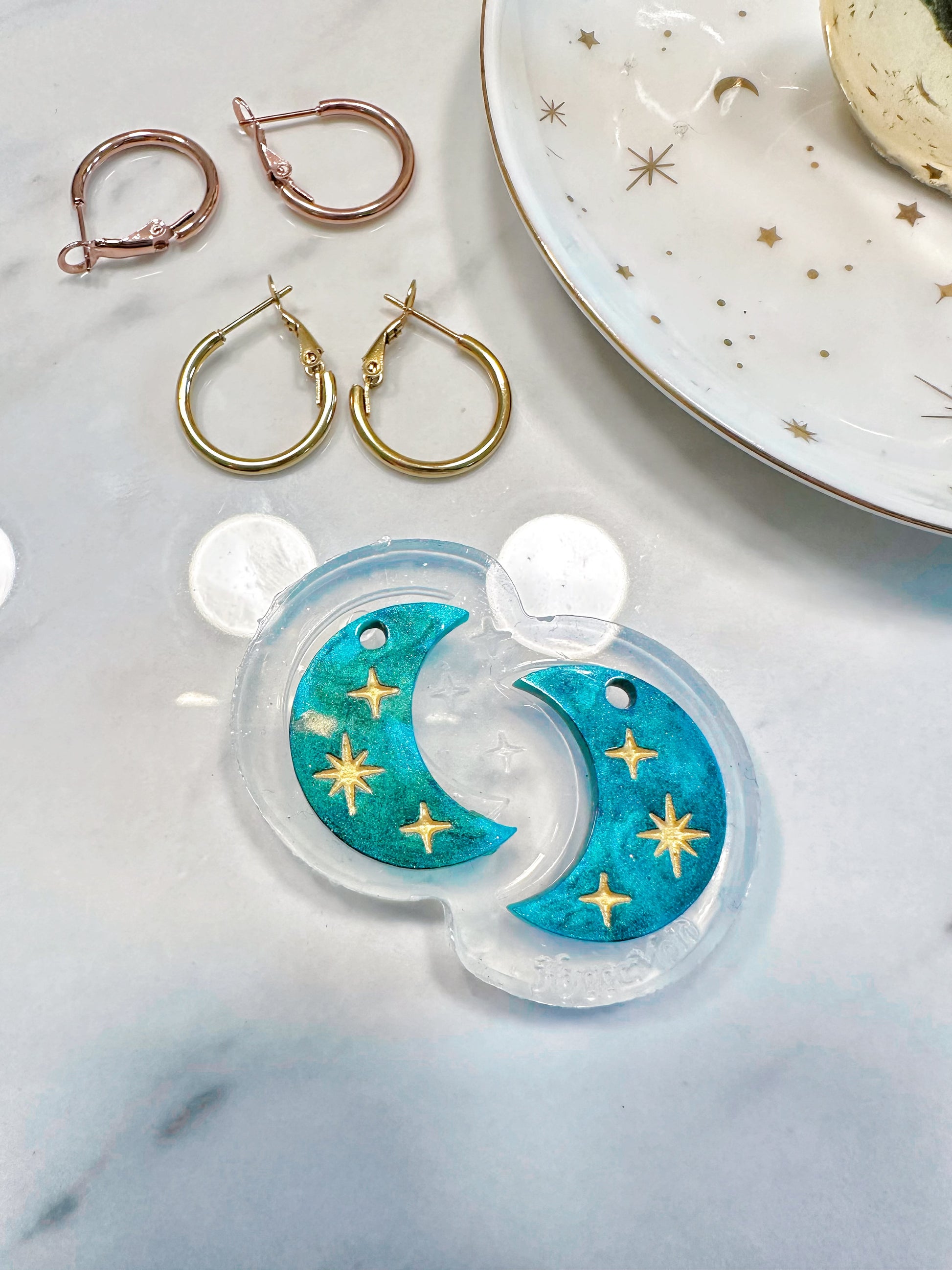 Create dreamy and celestial hoop charms and dangle earrings with our Dainty Engraved Celestial Moon Dangly Charm Hoop Earring Mold. Measuring at 2.6 cm, this mold boasts a glossy finish and deep etchings for easy paint filling.