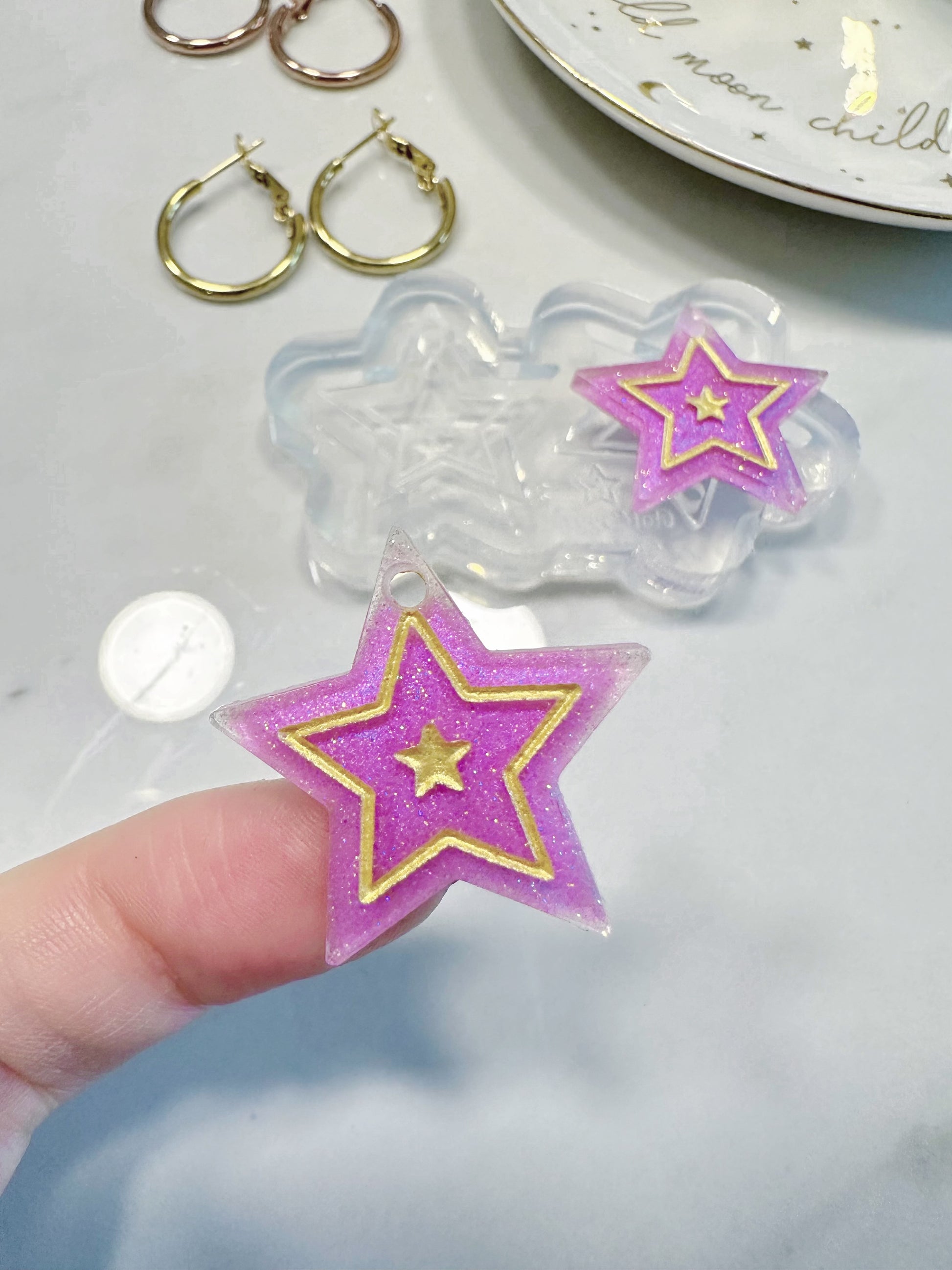 Create dreamy and celestial hoop charms and dangle earrings with our Dainty Engraved Star Dangly Charm Hoop Earring Mold. Measuring at 2.6 cm, this mold boasts a glossy finish and deep etchings for easy paint filling.