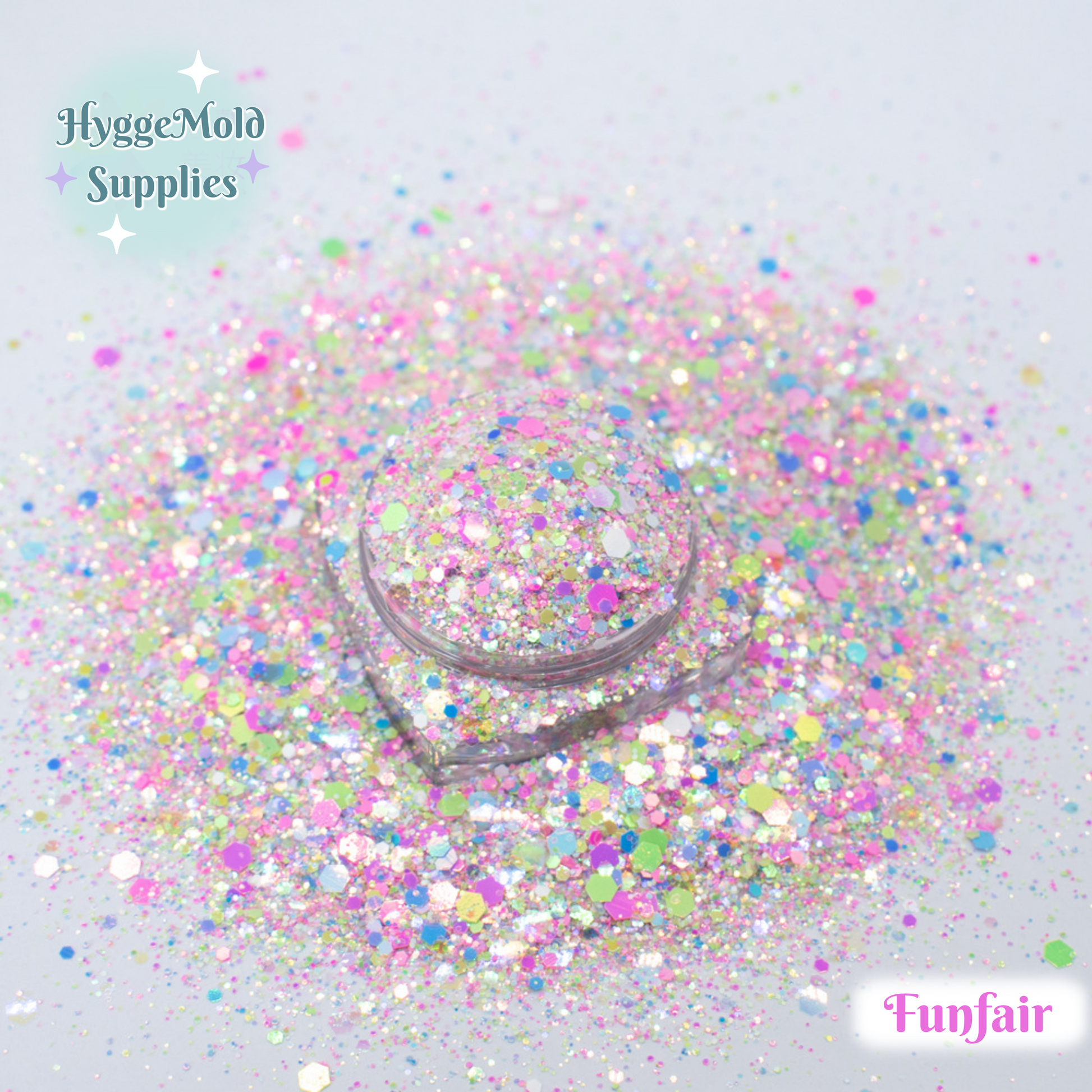 Funfair - a playful and whimsical mix of pastel colors, evoking the joy and excitement of a carnival or funfair, with a subtle iridescent sparkle