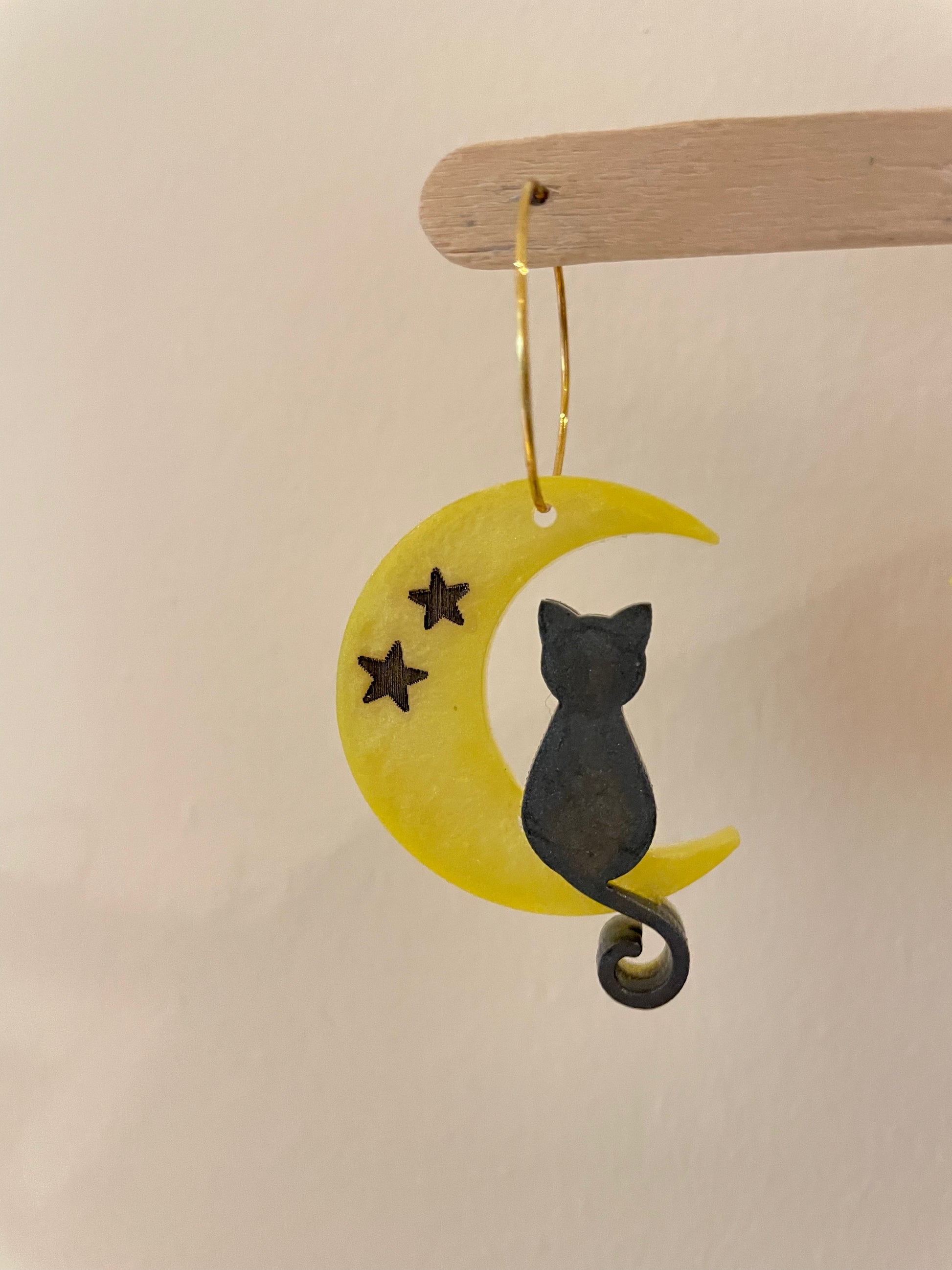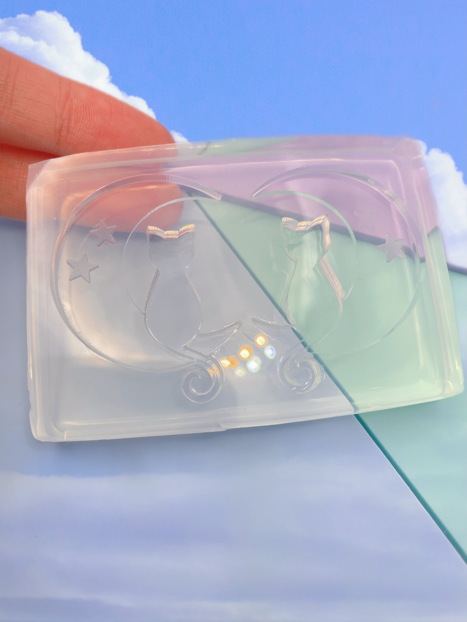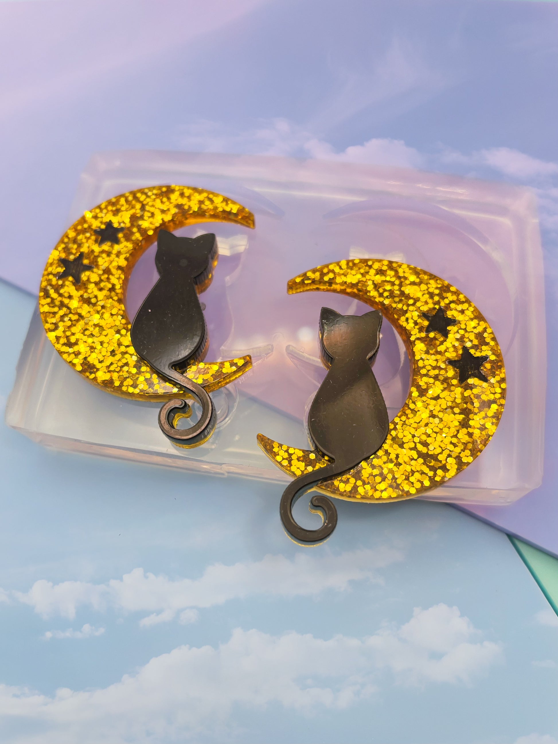 4.2 cm Sitting Cat On Crescent Moon Stars Night Sky Multi-use Brooch Dangle Earring Mold