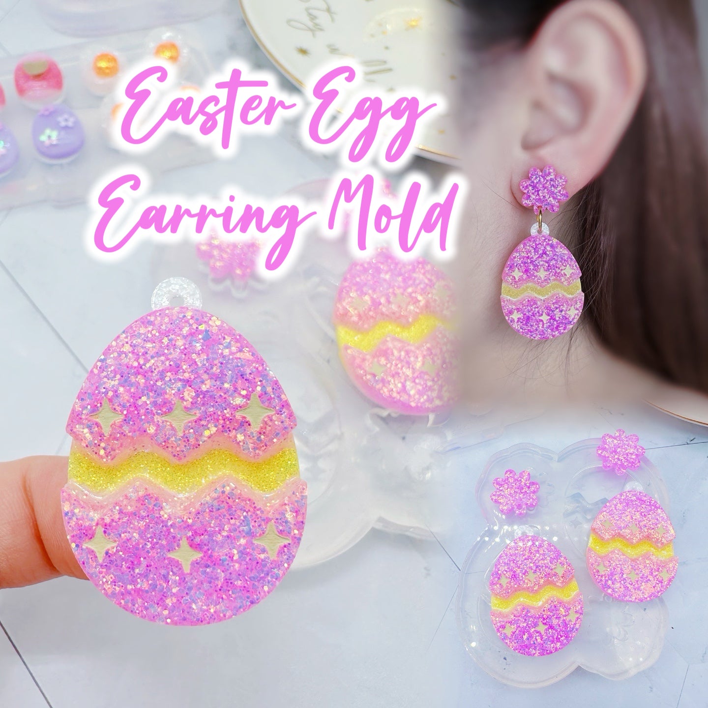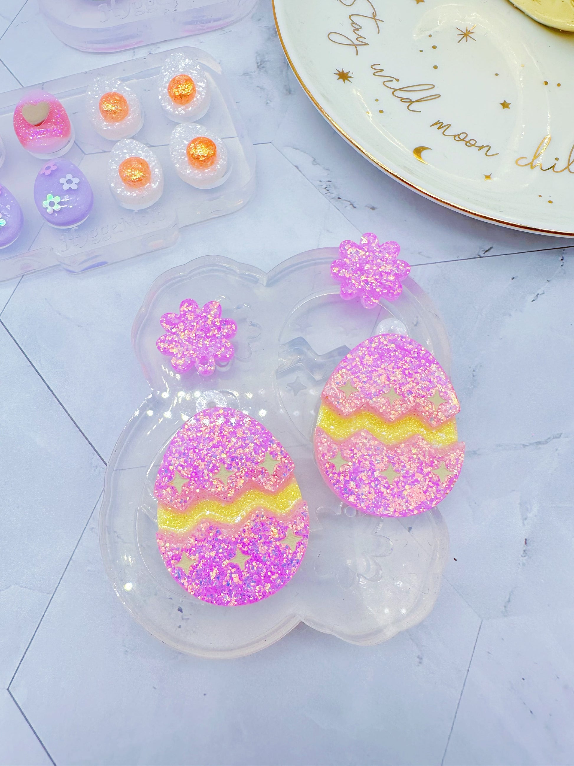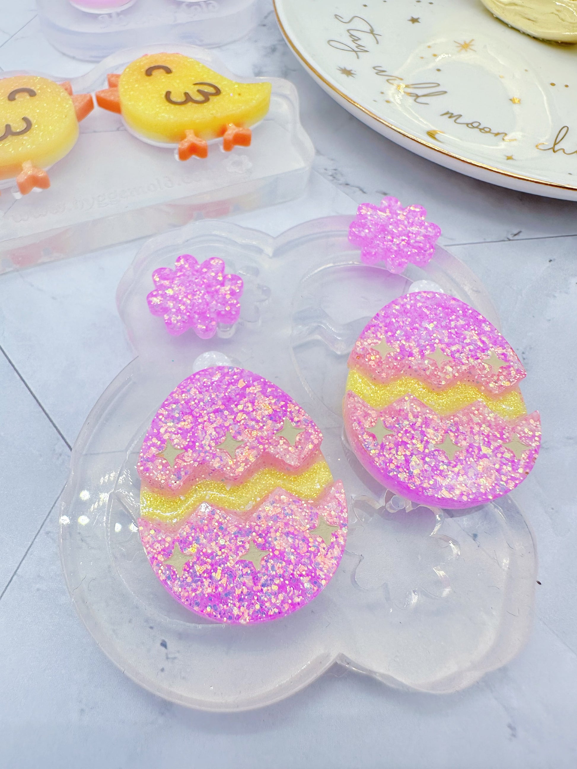 Craft beautiful Easter-themed earrings with the Cracked Egg Dangle Earring Mold, featuring a 3.7 cm design of fun, cute cracked eggs with sparkle pattern, completed with daisy flower toppers.