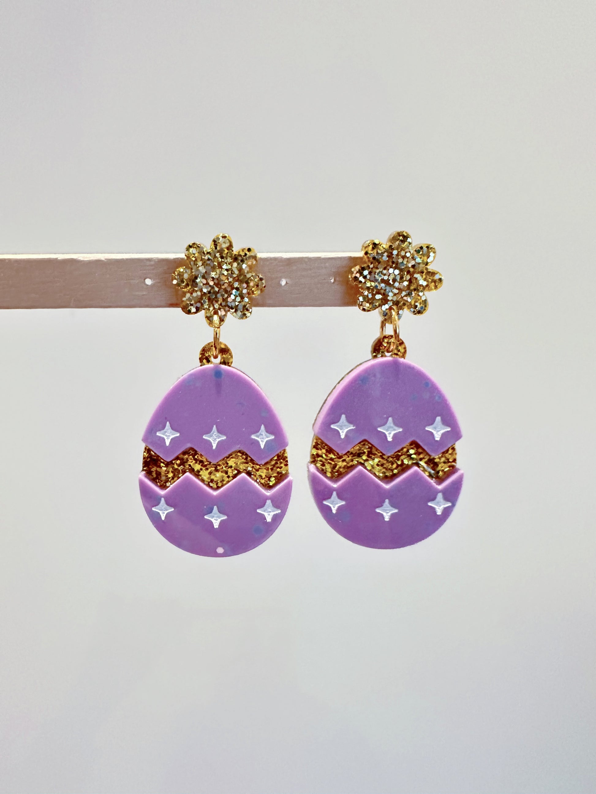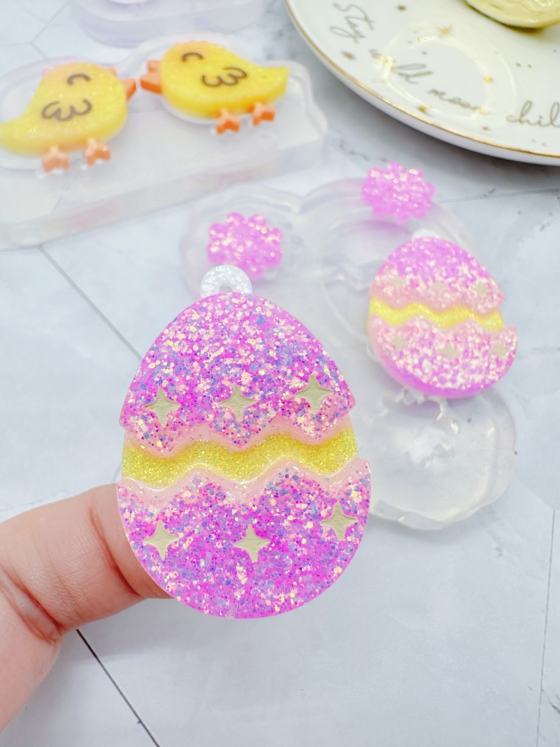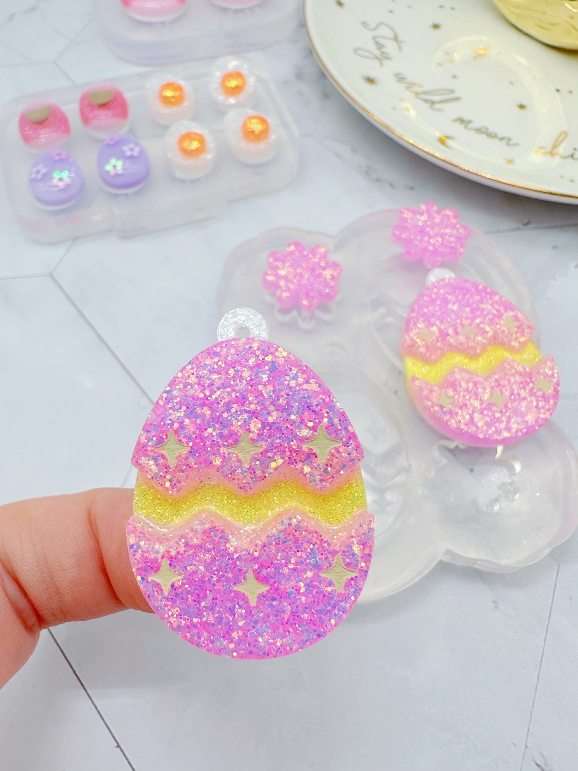 Craft beautiful Easter-themed earrings with the Cracked Egg Dangle Earring Mold, featuring a 3.7 cm design of fun, cute cracked eggs with sparkle pattern, completed with daisy flower toppers.