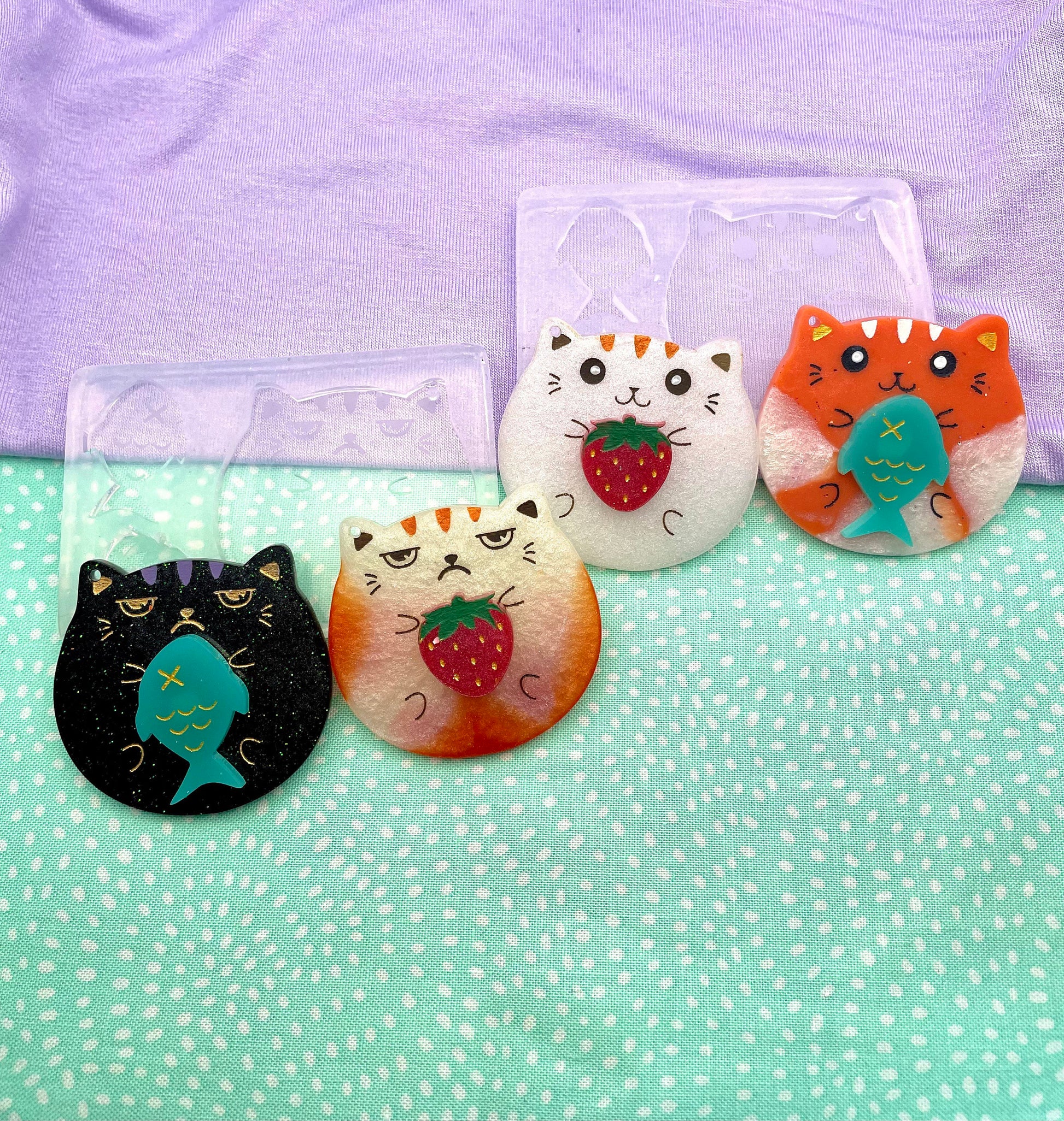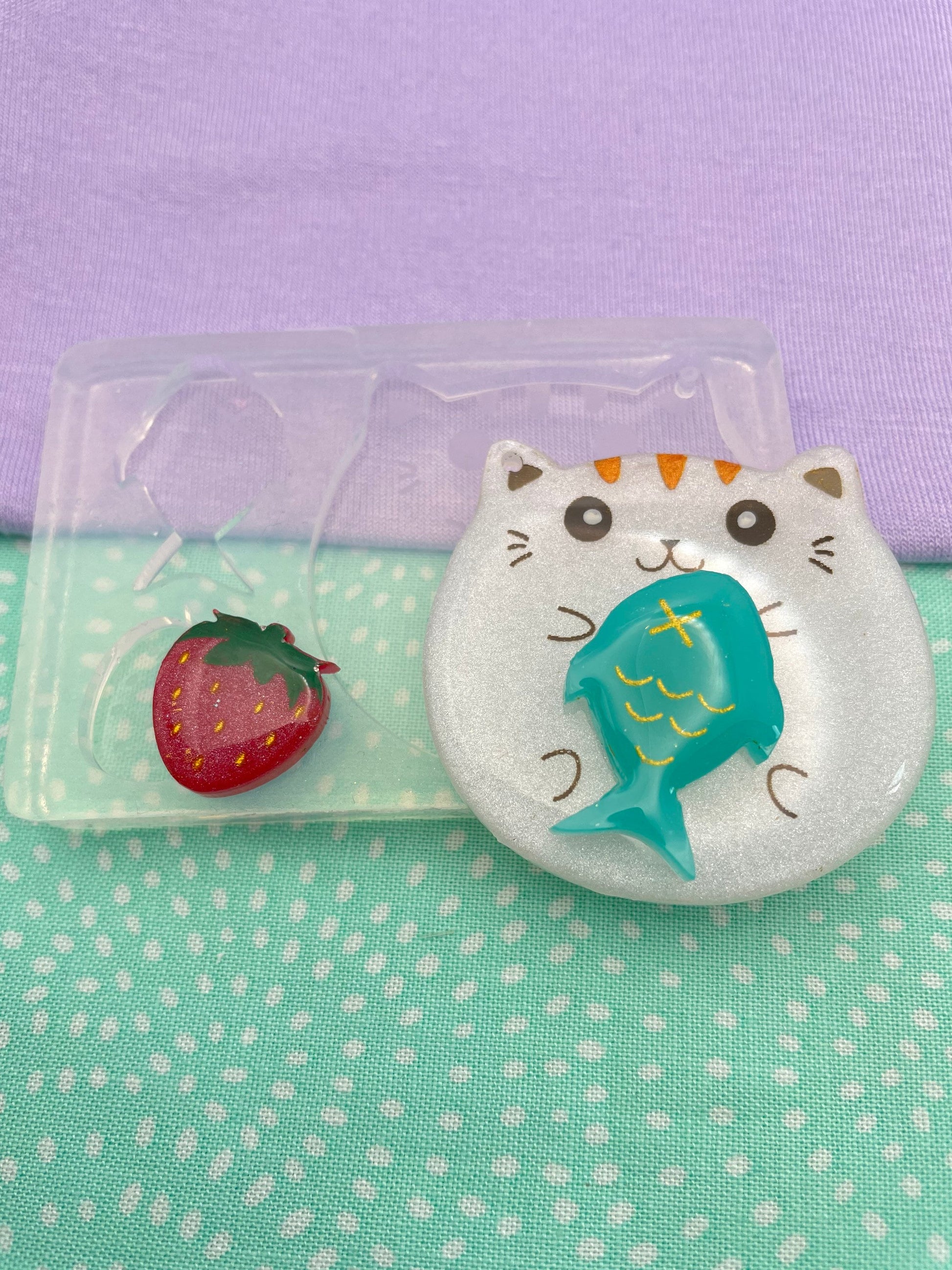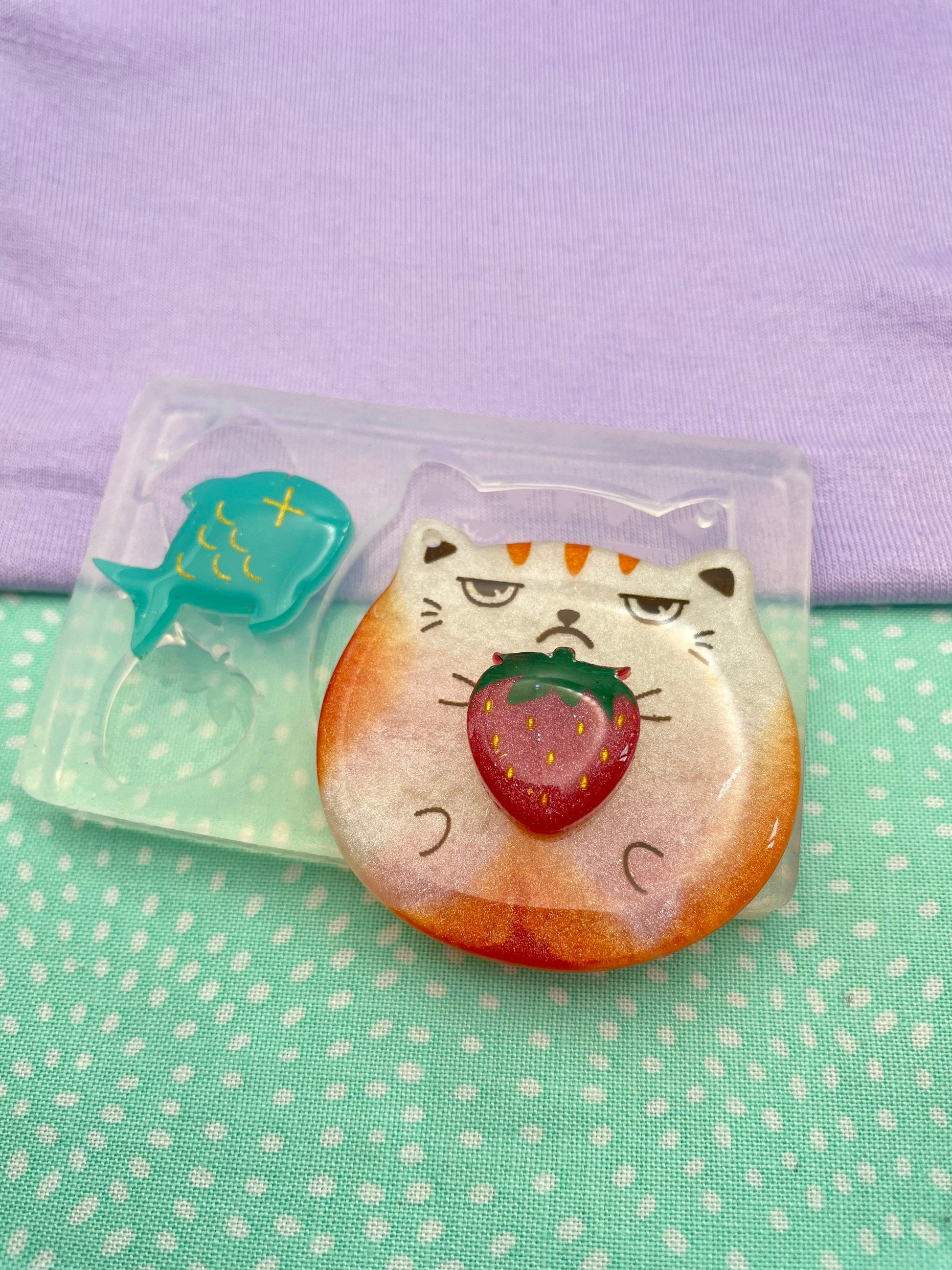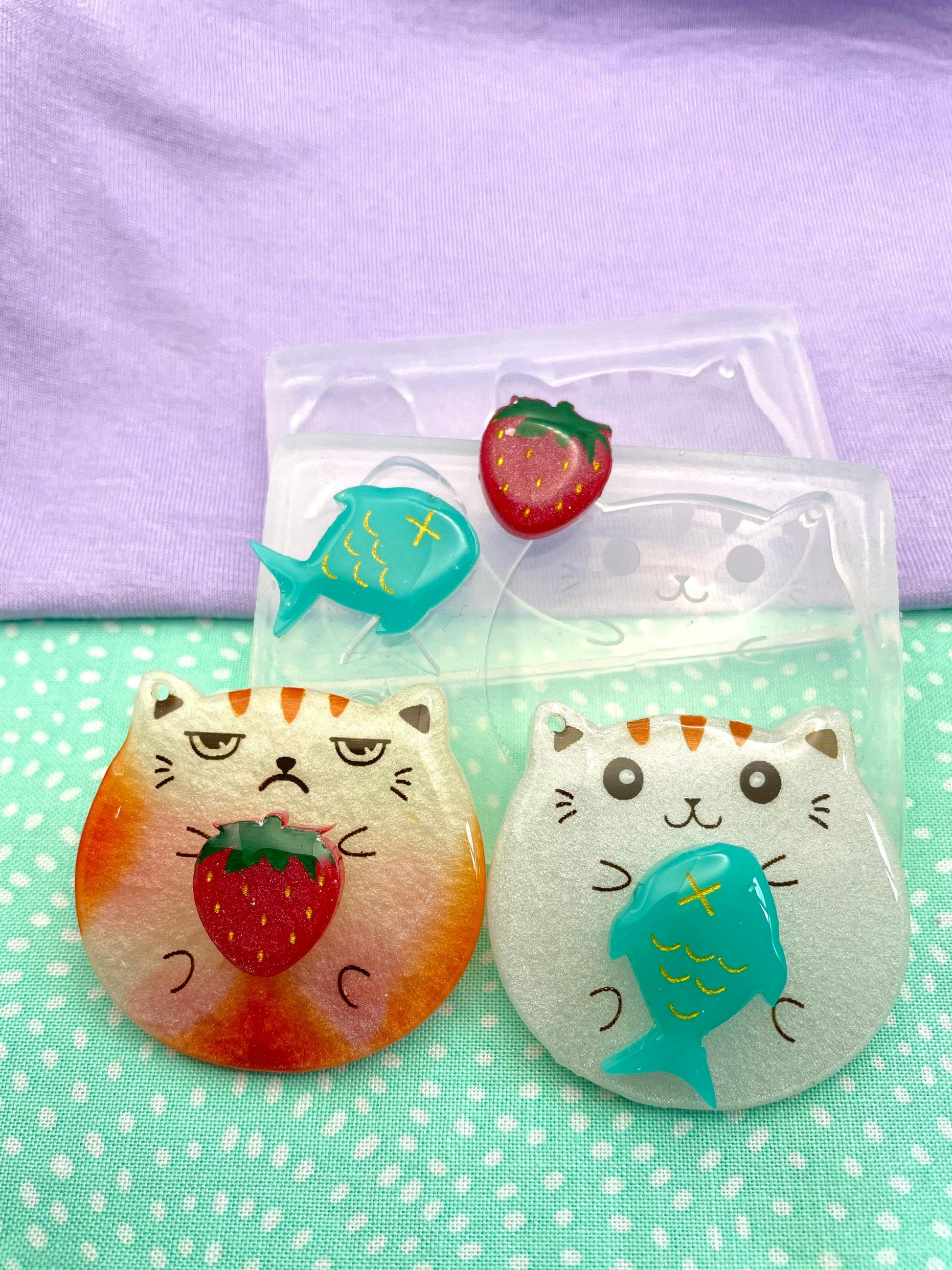 Each set includes a cat (grumpy/ happy), a strawberry and a fish.