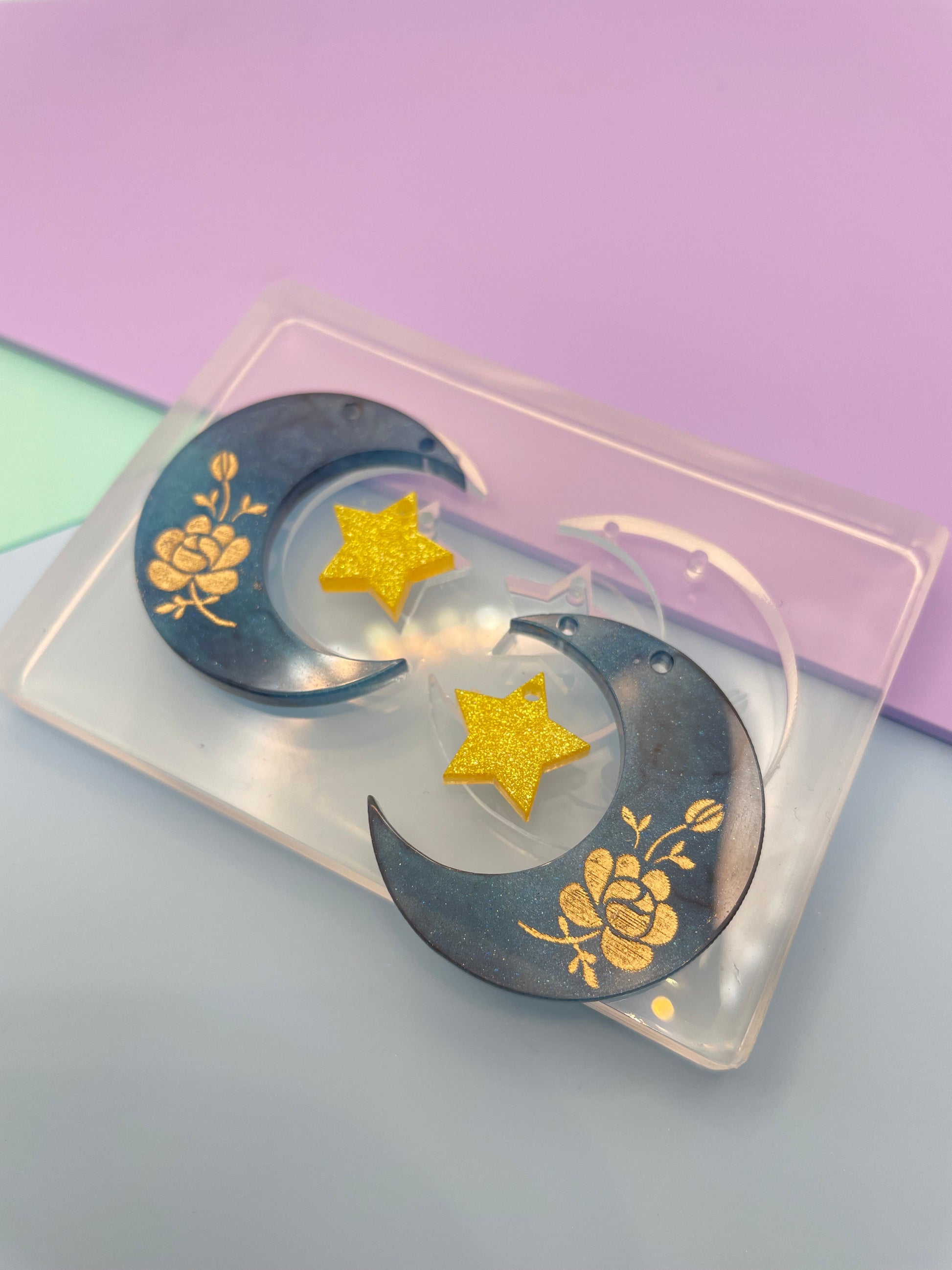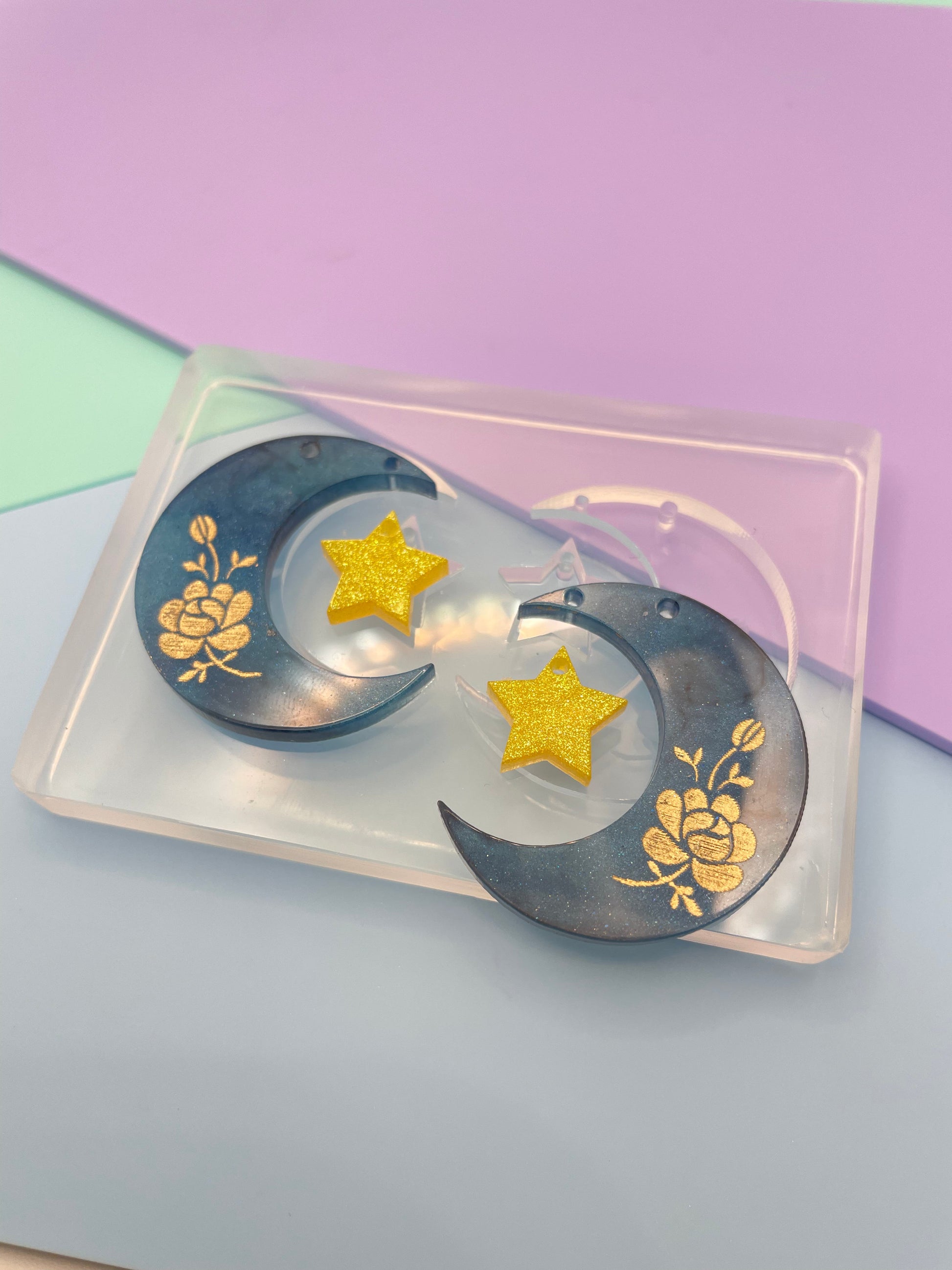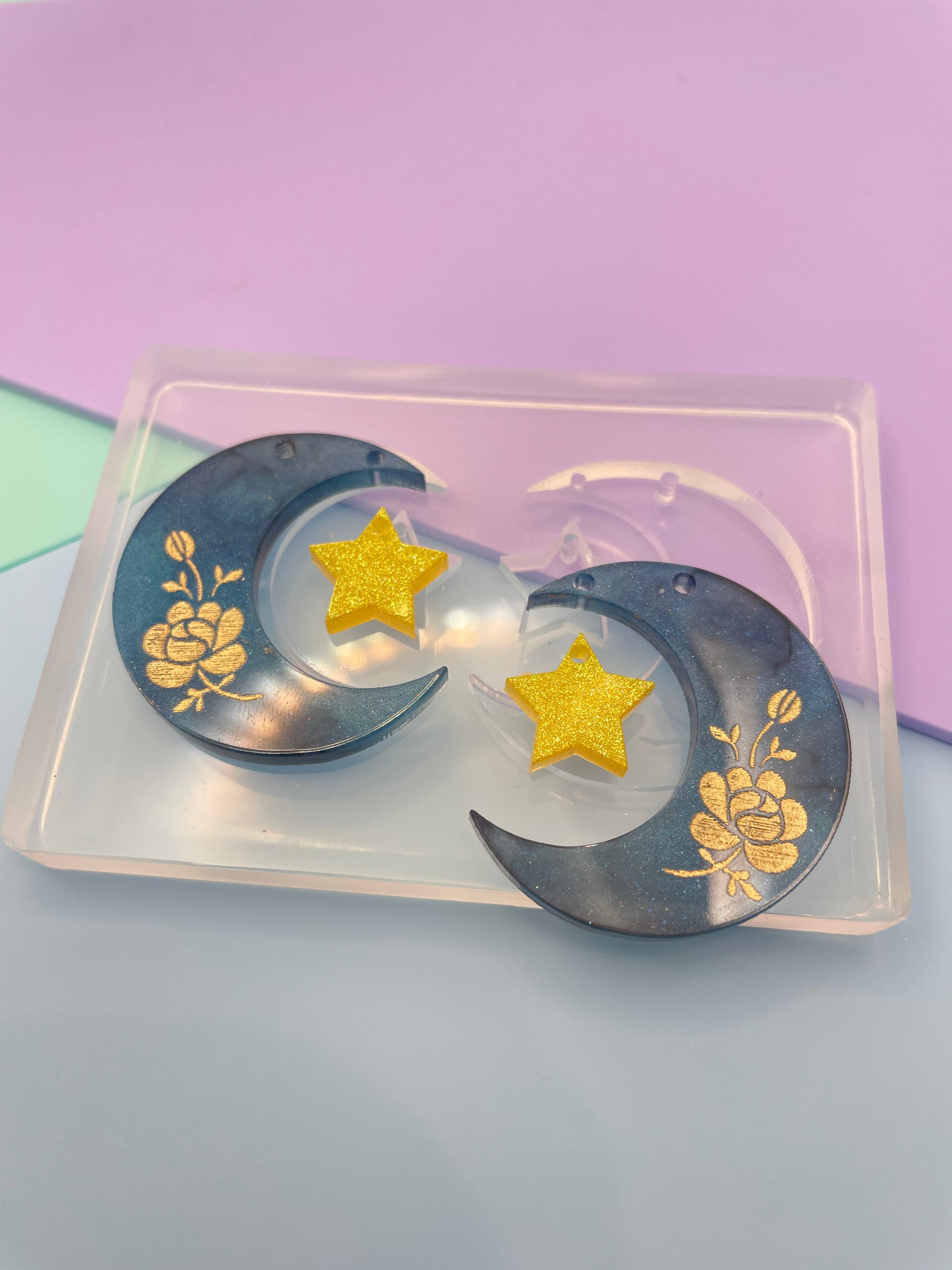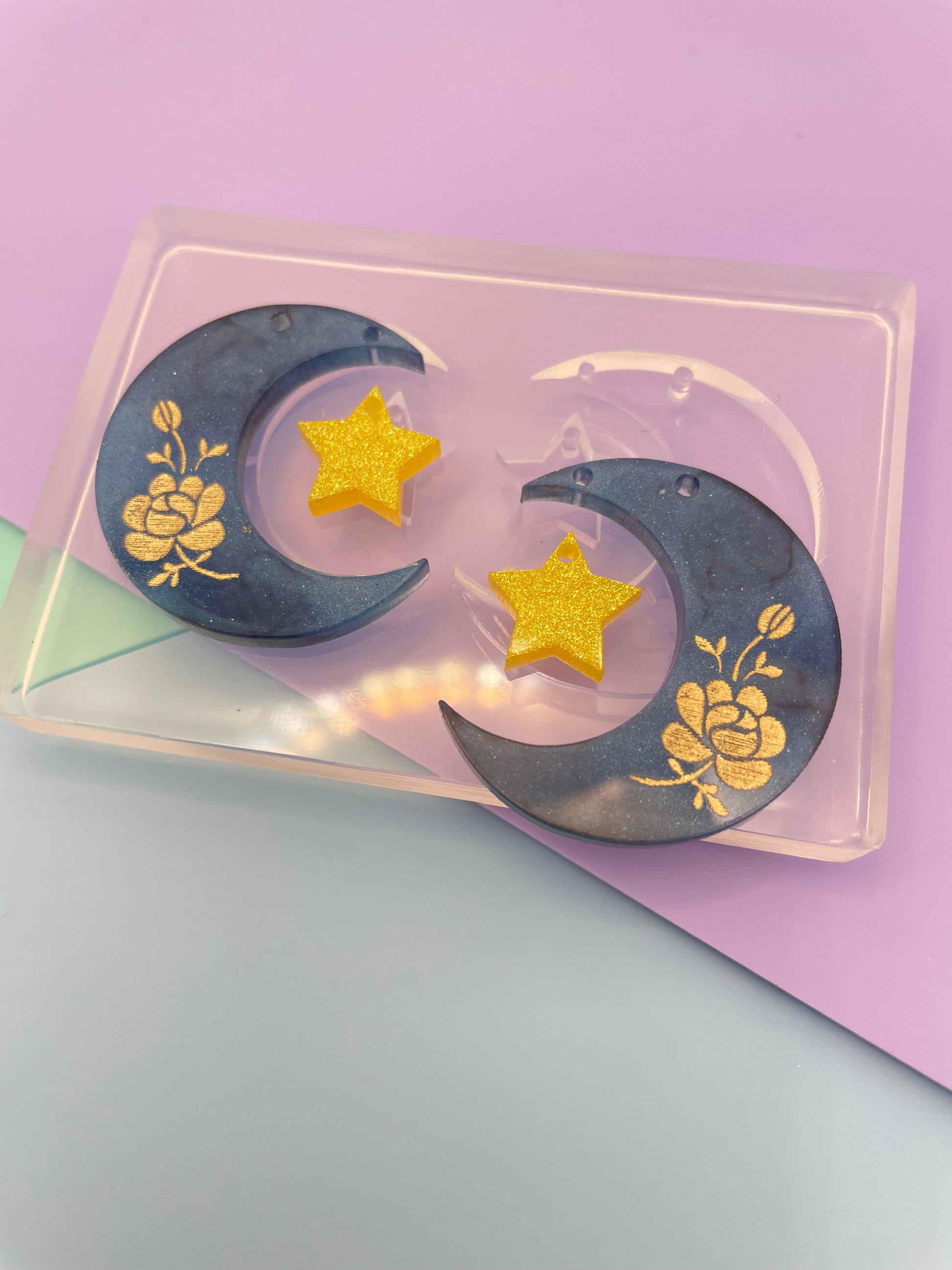 Engraved Peony Floral Crescent Moon Dangle Star Earring Mold