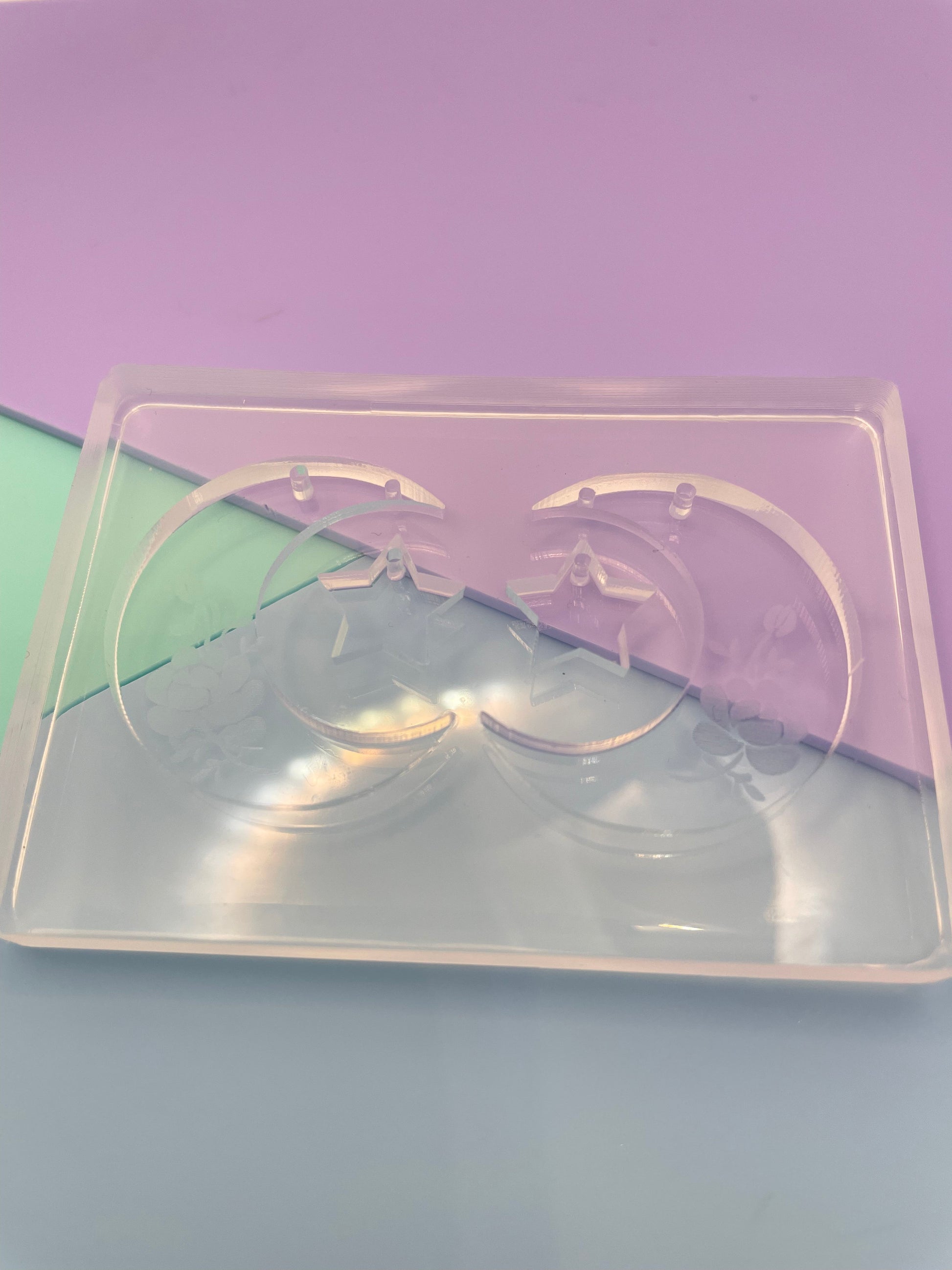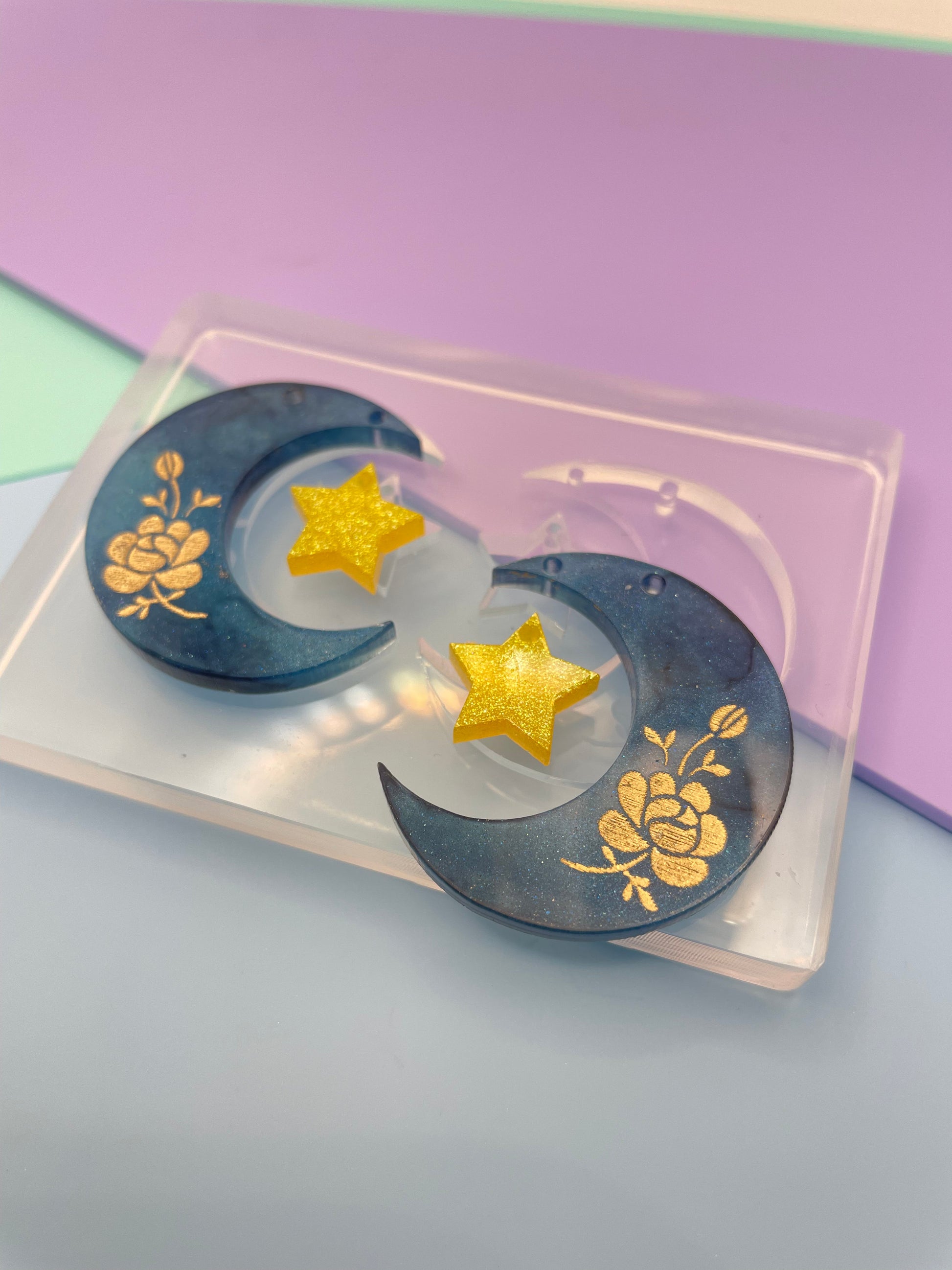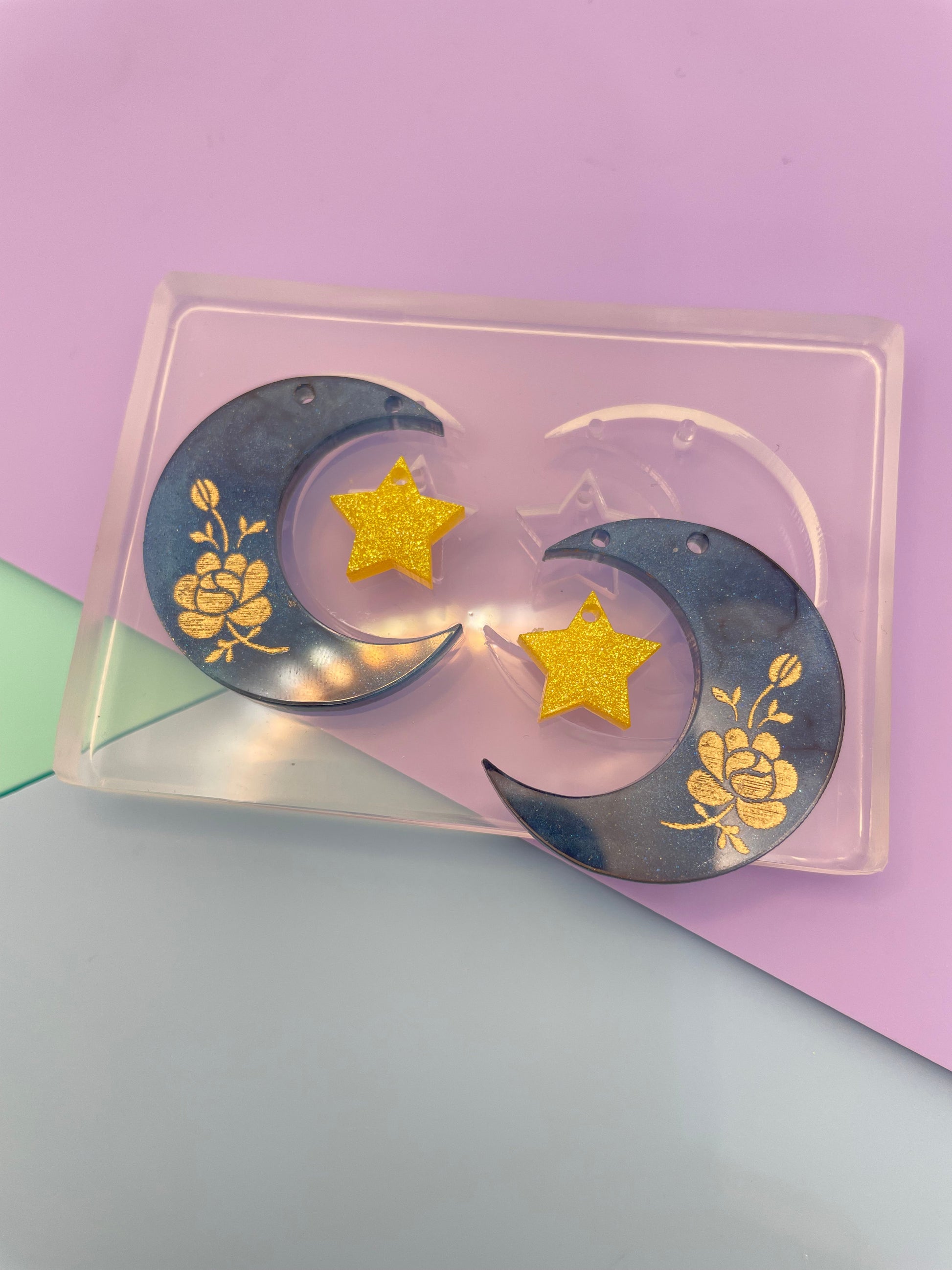 Engraved Peony Floral Crescent Moon Dangle Star Earring Mold