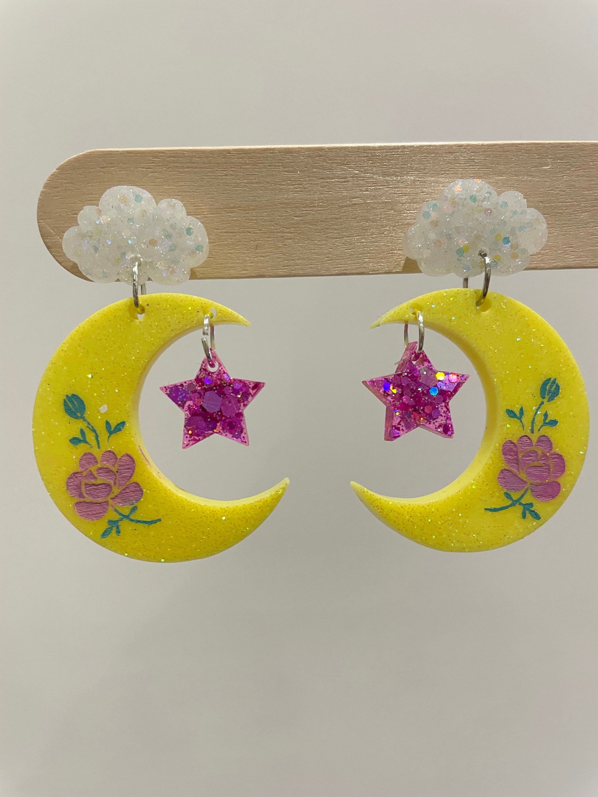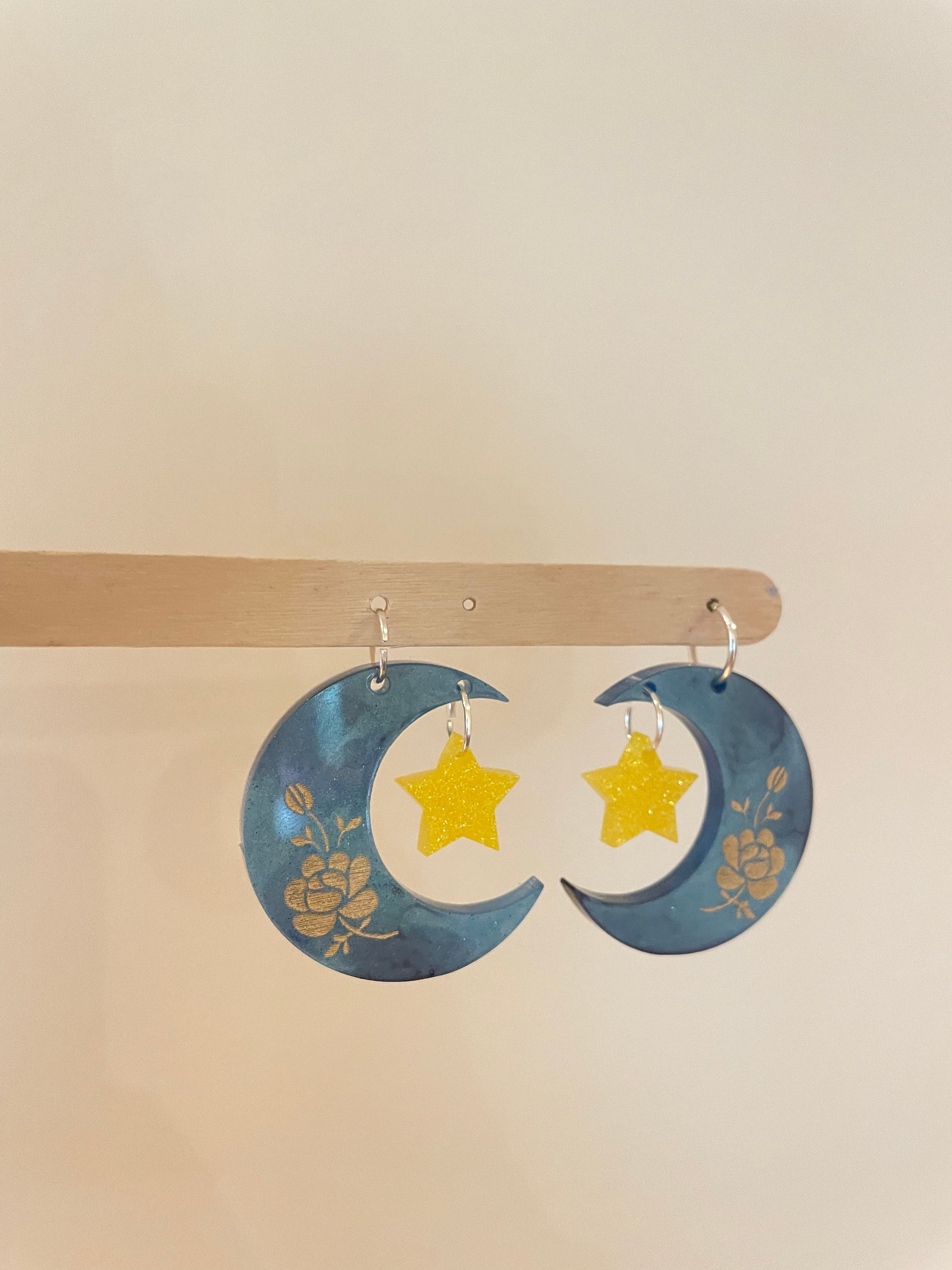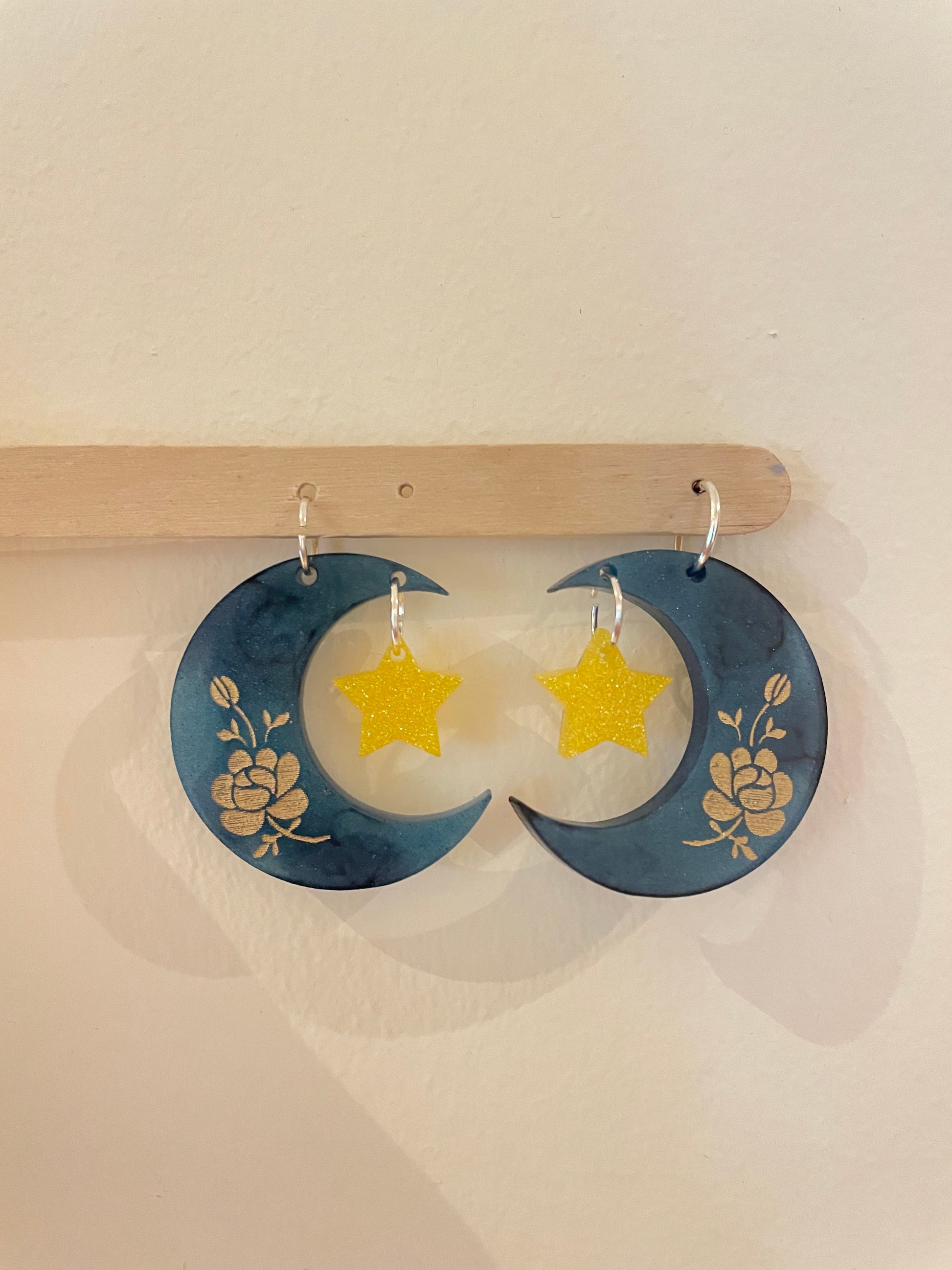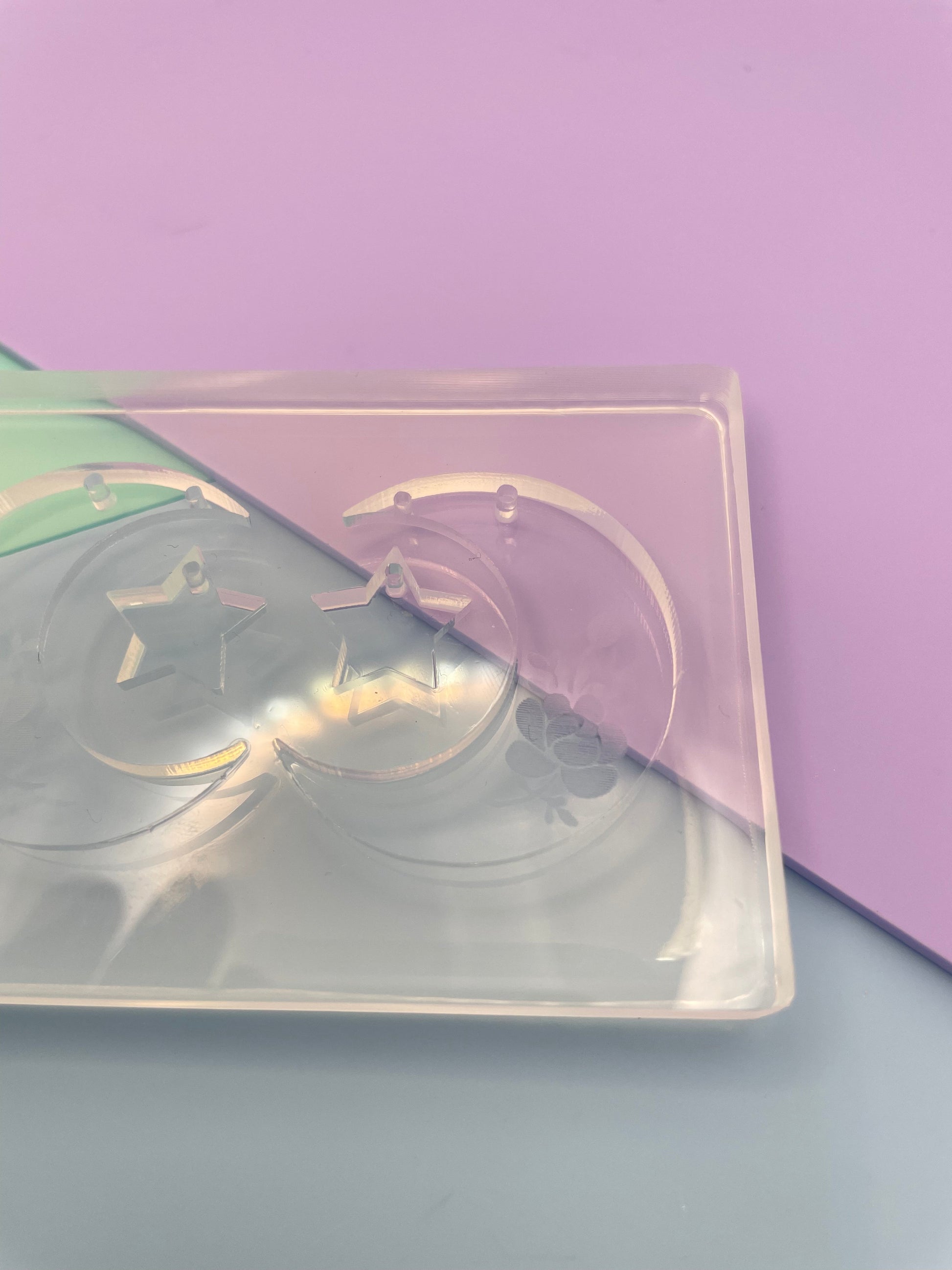 Engraved Peony Floral Crescent Moon Dangle Star Earring Mold