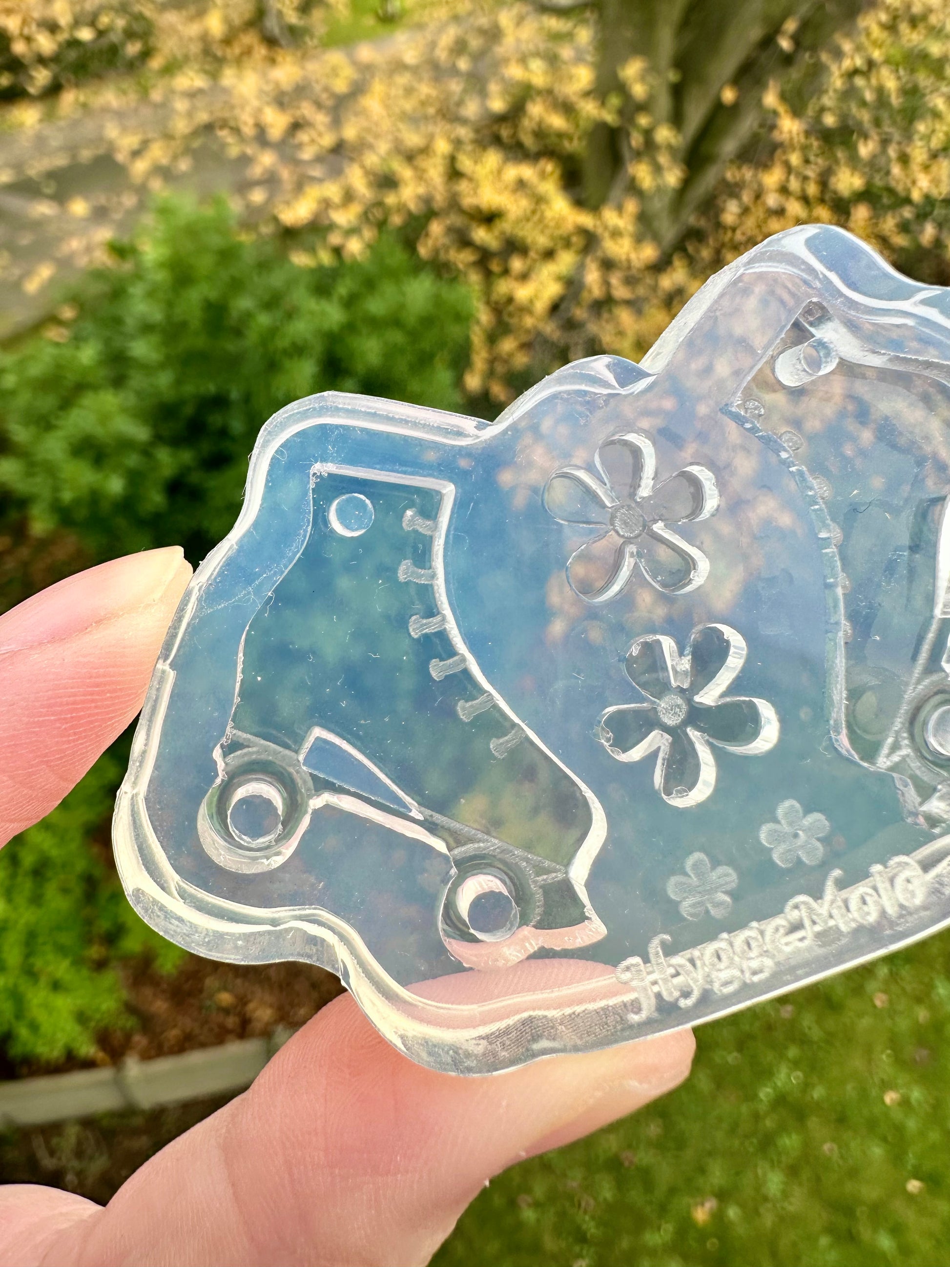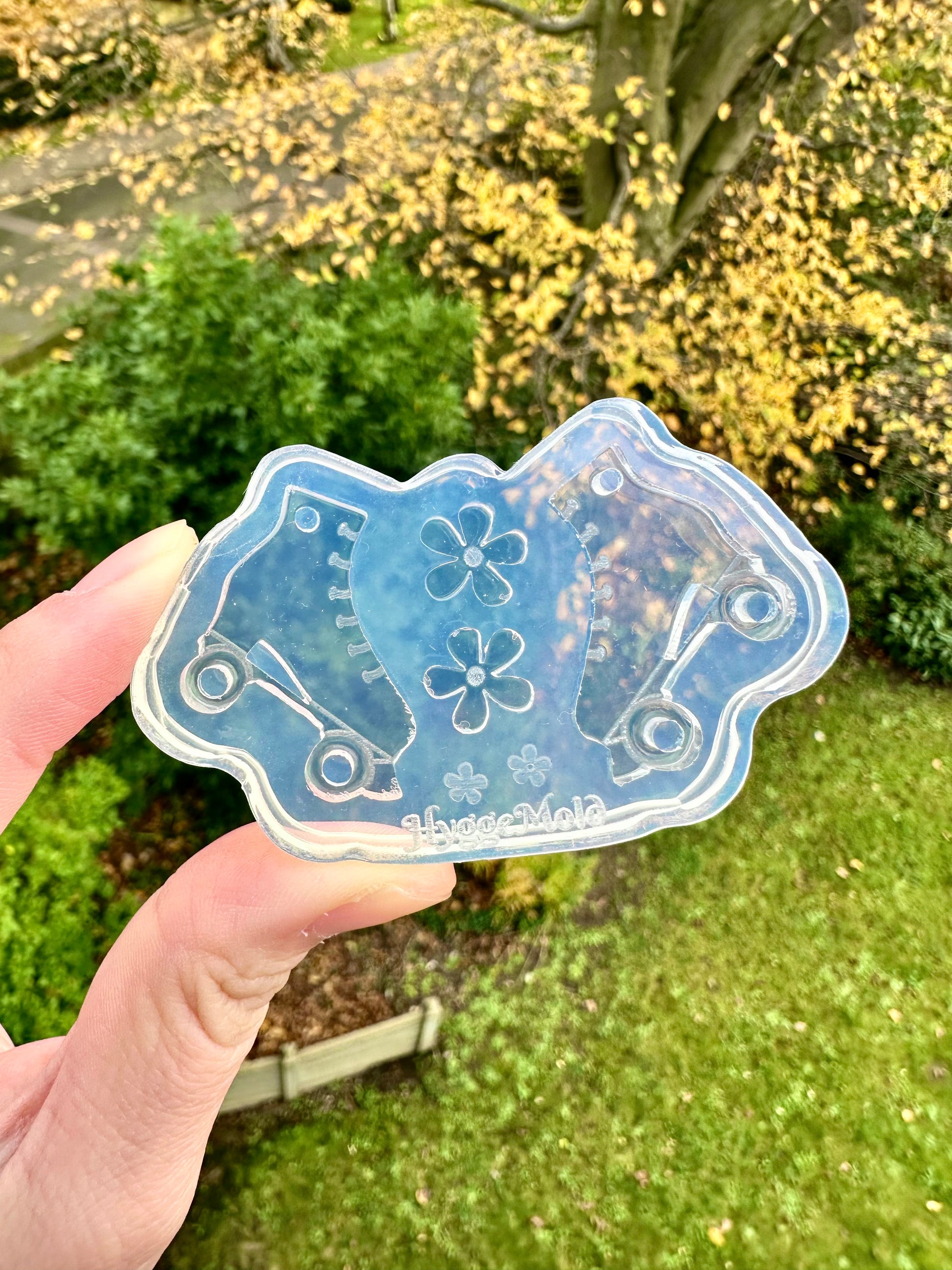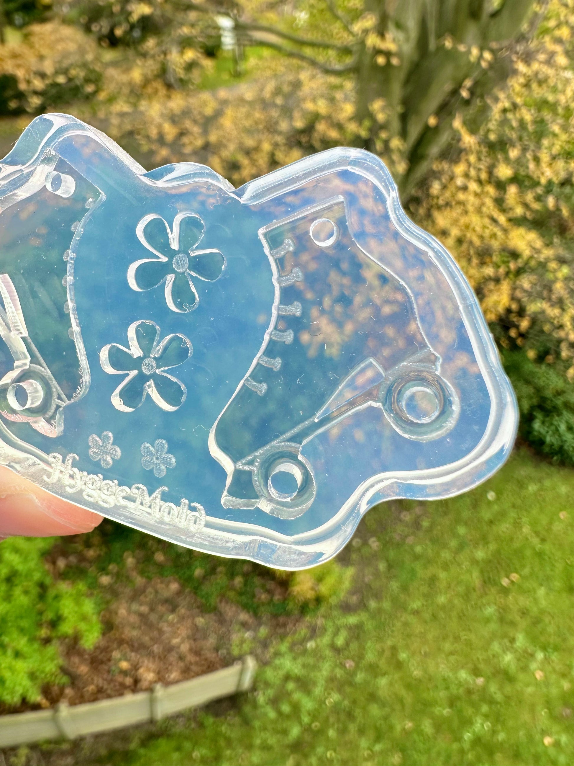 This mold includes a pair of roller skates with slightly domed donut wheels, engraved shoe lace details and optional engraved flower accessories